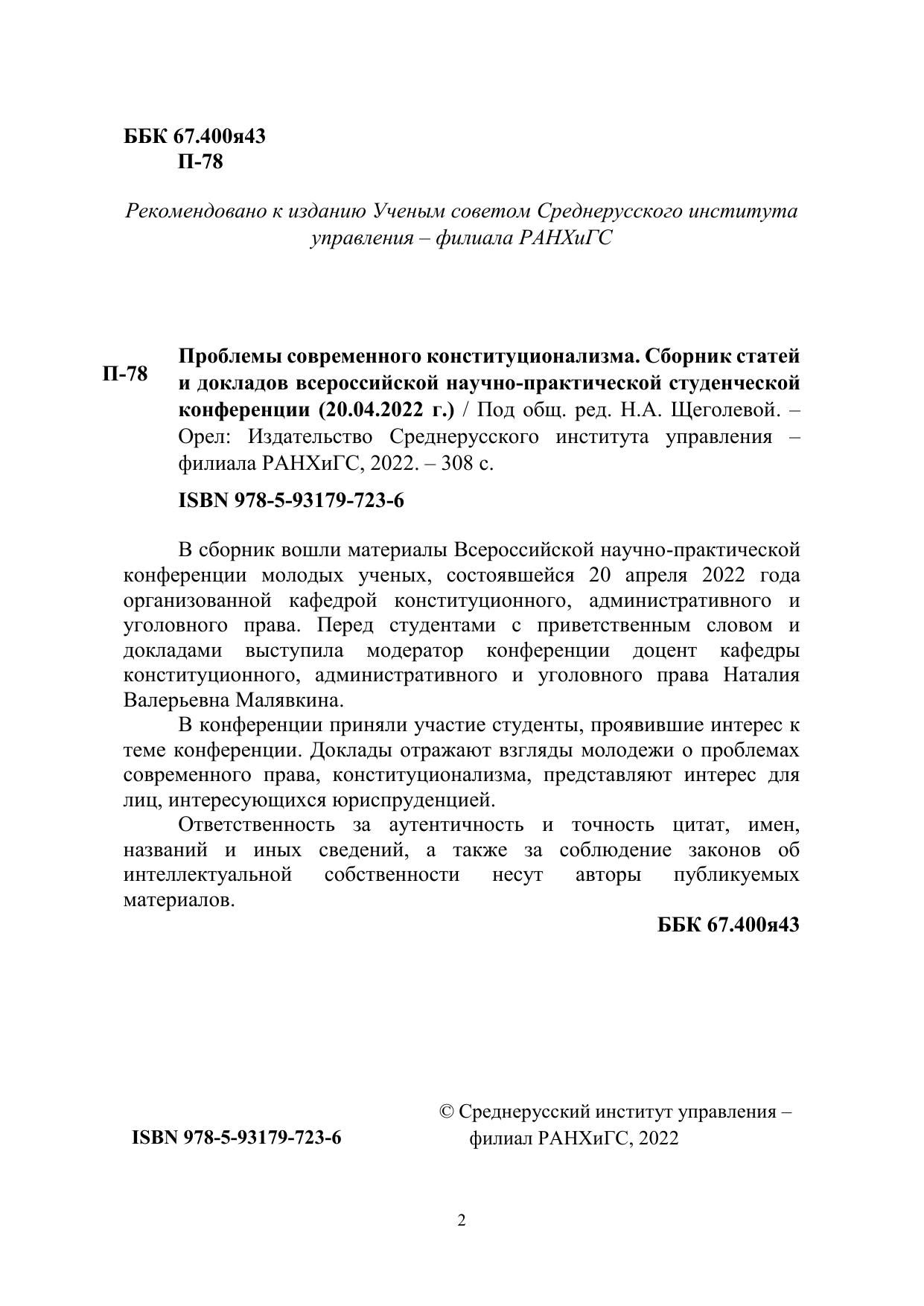 В сборник вошли материалы Всероссийской научно-практической конференции молодых ученых, состоявшейся 20 апреля 2022 года организованной кафедрой конституционного, административного и уголовного права. Перед студентами с приветственным словом и докладами выступила модератор конференции доцент кафедры конституционного, административного и уголовного права Наталия Валерьевна Малявкина. В конференции приняли участие студенты, проявившие интерес к теме конференции. Доклады отражают взгляды молодежи о проблемах современного права, конституционализма, представляют интерес для лиц, интересующихся юриспруденцией. Ответственность за аутентичность и точность цитат, имен, названий и иных сведений, а также за соблюдение законов об интеллектуальной собственности несут авторы публикуемых материалов.