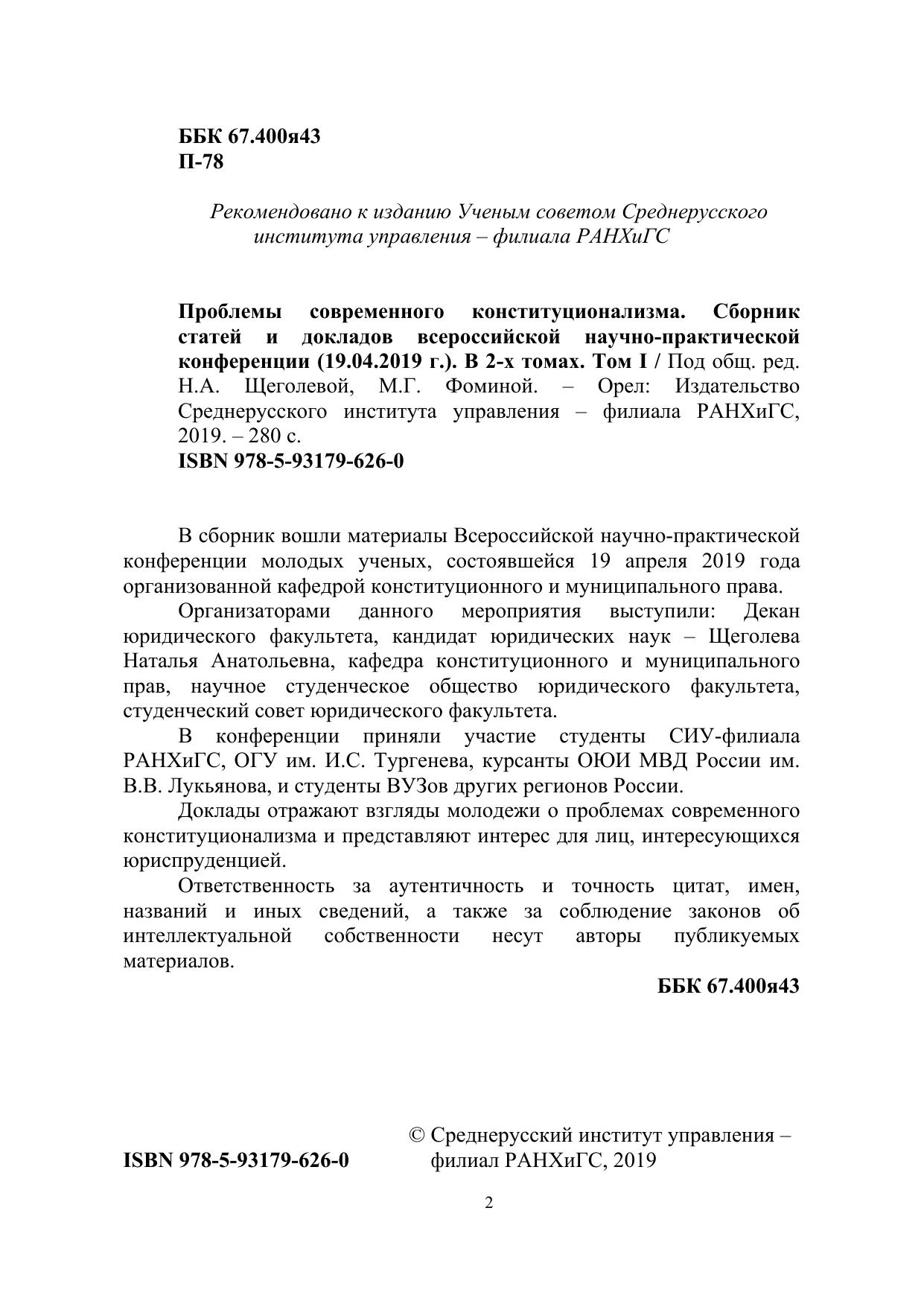 В сборник вошли материалы Всероссийской научно-практической конференции молодых ученых, состоявшейся 19 апреля 2019 года организованной кафедрой конституционного и муниципального права. Организаторами данного мероприятия выступили: Декан юридического факультета, кандидат юридических наук – Щеголева Наталья Анатольевна, кафедра конституционного и муниципального прав, научное студенческое общество юридического факультета, студенческий совет юридического факультета. В конференции приняли участие студенты СИУ-филиала РАНХиГС, ОГУ им. И.С. Тургенева, курсанты ОЮИ МВД России им. В.В. Лукьянова, и студенты ВУЗов других регионов России. Доклады отражают взгляды молодежи о проблемах современного конституционализма и представляют интерес для лиц, интересующихся юриспруденцией. Ответственность за аутентичность и точность цитат, имен, названий и иных сведений, а также за соблюдение законов об интеллектуальной собственности несут авторы публикуемых материалов.