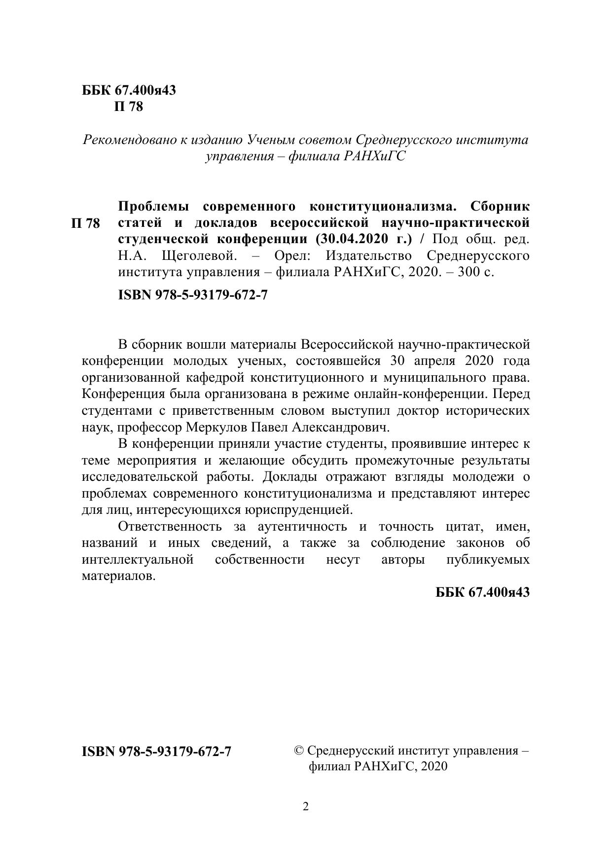В сборник вошли материалы Всероссийской научно-практической конференции молодых ученых, состоявшейся 30 апреля 2020 года организованной кафедрой конституционного и муниципального права. Конференция была организована в режиме онлайн-конференции. Перед студентами с приветственным словом выступил доктор исторических наук, профессор Меркулов Павел Александрович. В конференции приняли участие студенты, проявившие интерес к теме мероприятия и желающие обсудить промежуточные результаты исследовательской работы. Доклады отражают взгляды молодежи о проблемах современного конституционализма и представляют интерес для лиц, интересующихся юриспруденцией. Ответственность за аутентичность и точность цитат, имен, названий и иных сведений, а также за соблюдение законов об интеллектуальной собственности несут авторы публикуемых материалов.