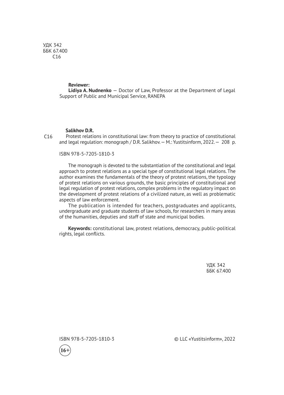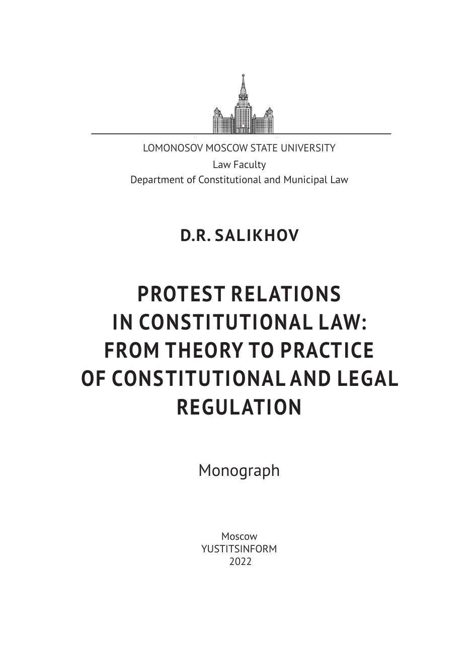 Монография посвящена обоснованию конституционно-правового подхода к протестным отношениям как к особому виду конституционных правоотношений. При этом автором рассматриваются основы теории протестных отношений, типология протестных отношений по различным основаниям, базовые принципы конституционно-правового регулирования протестных отношений, комплексные проблемы в регуляторном воздействии на развитие протестных отношений цивилизованного характера, а также проблемные аспекты правоприменительной деятельности. Издание предназначено для преподавателей, аспирантов и соискателей, студентов бакалавриата и магистратуры юридических учебных заведений, для научных работников многих направлений гуманитарного профиля, депутатов и сотрудников аппаратов государственных и муниципальных органов.