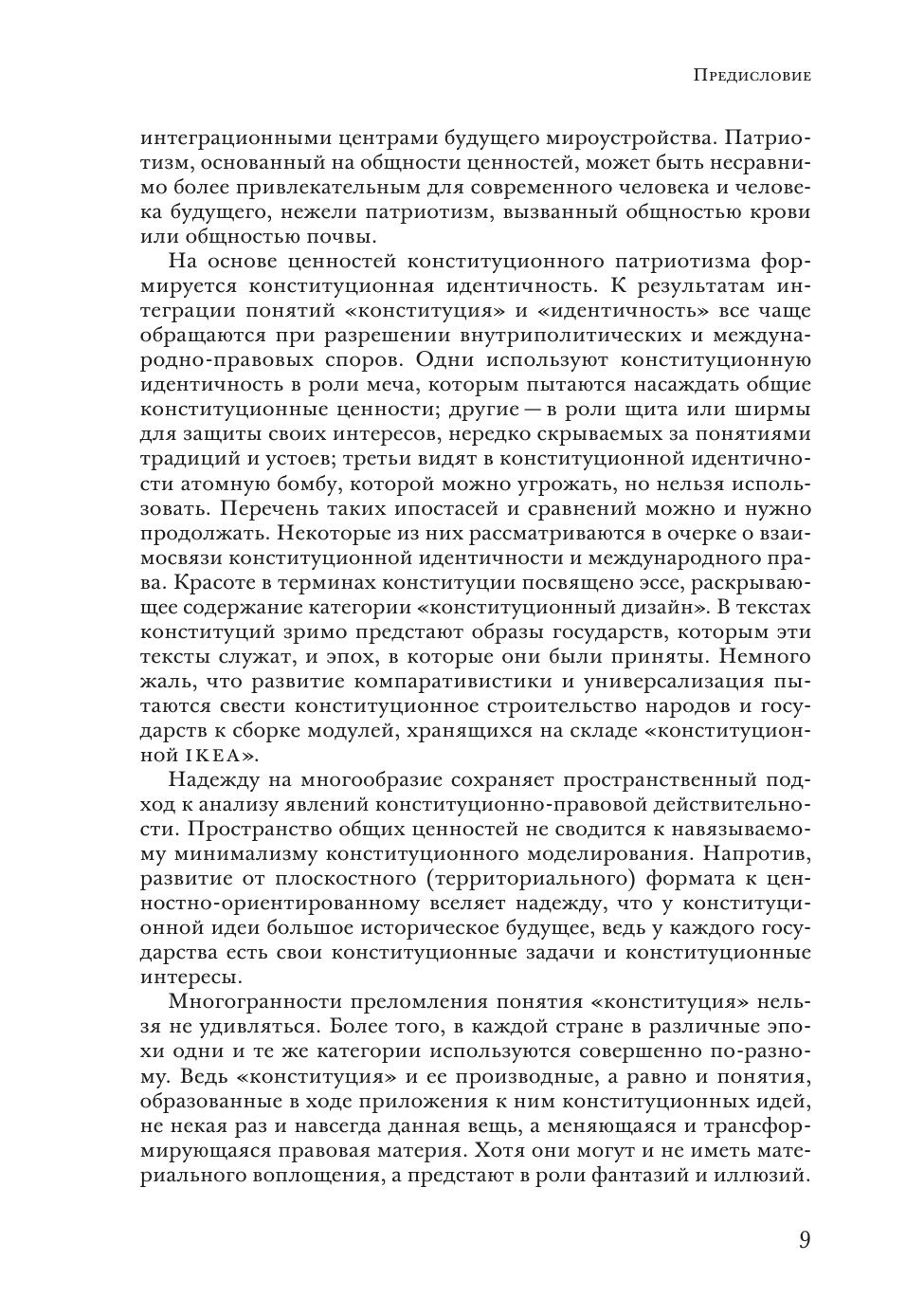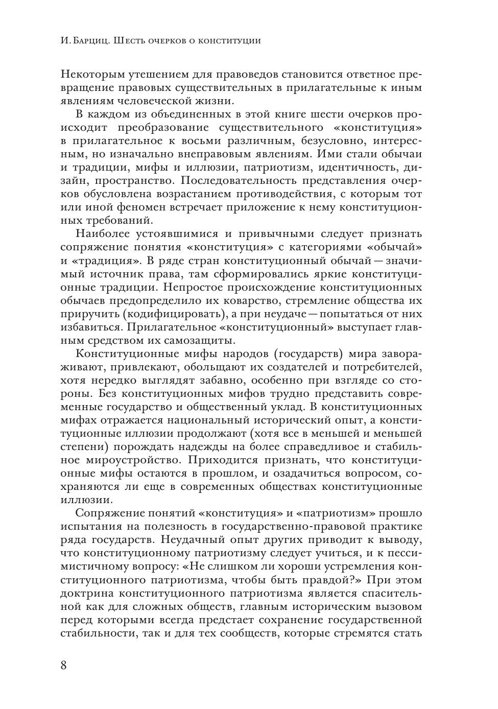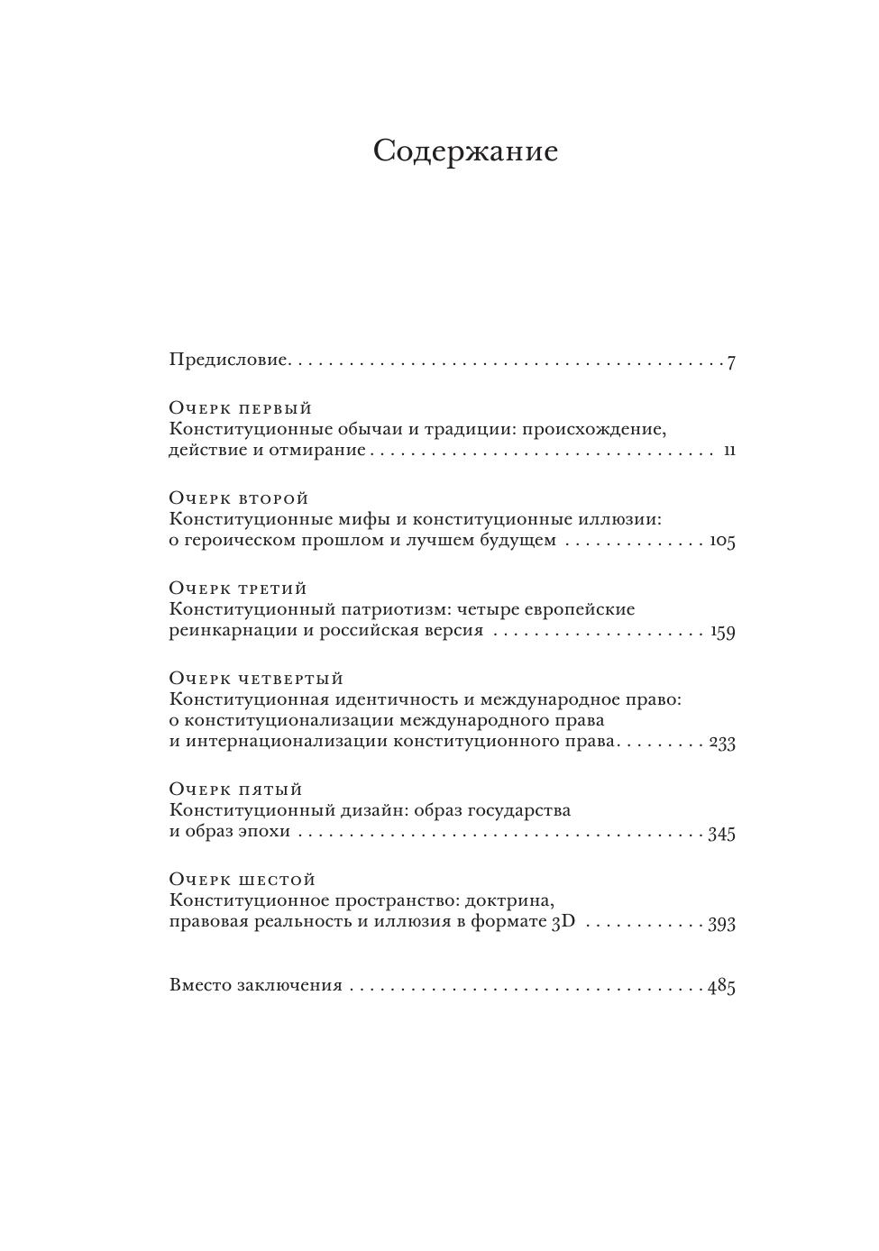 В книге собраны написанные в 2018–2020 годах очерки, в каждом из которых раскрывается содержание одной из широко употребляемых внеправовых категорий (таких как патриотизм и идентичность, обычаи и традиции, мифы и иллюзии, дизайн и пространство) через призму конституционной теории. В своей совокупности очерки составили единое, основанное на изучении отечественного и зарубежного конституционного опыта исследование, направленное на развитие современной доктрины российского конституционализма. Издание обращено к широкому кругу читателей, ко всем интересующимся будущим конституционно-правовой системы России.