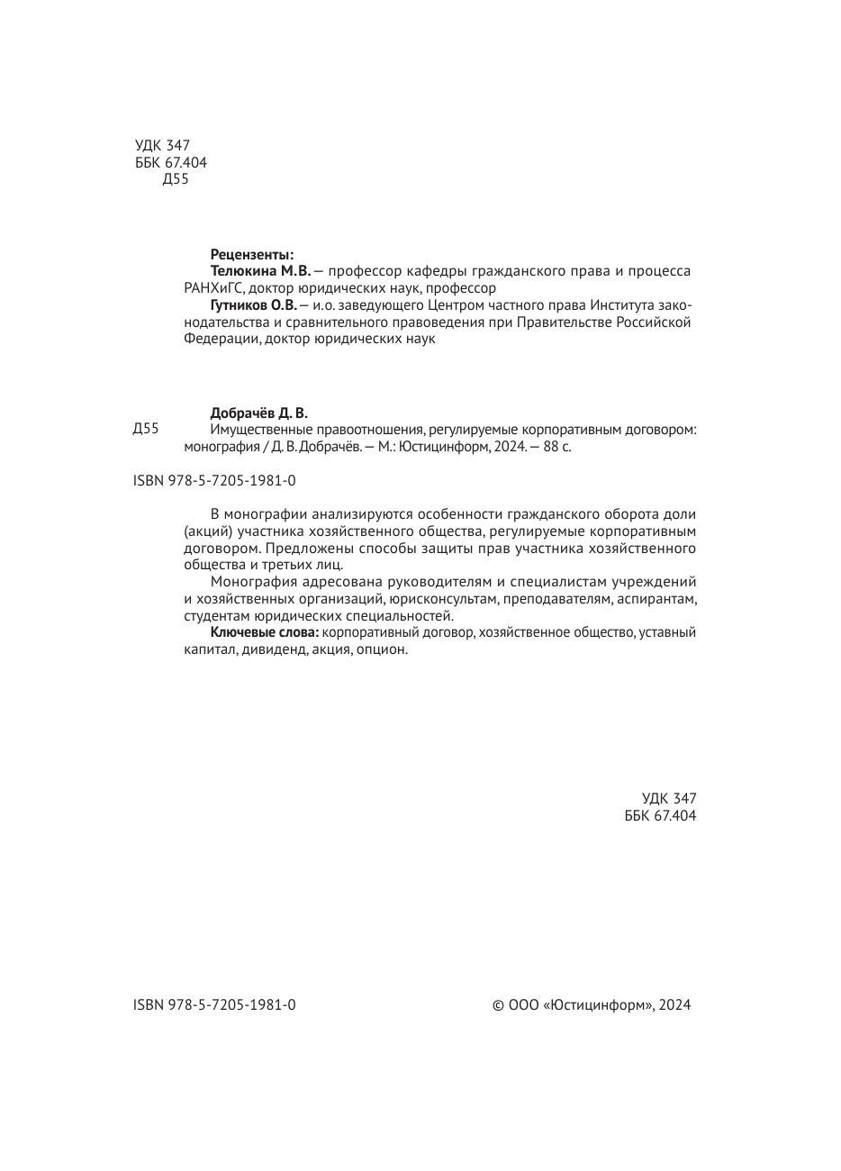 В монографии анализируются особенности гражданского оборота доли (акций) участника хозяйственного общества, регулируемые корпоративным договором. Предложены способы защиты прав участника хозяйственного общества и третьих лиц.