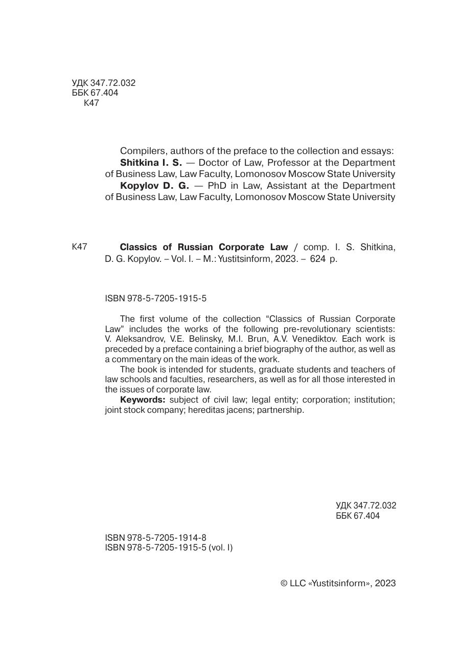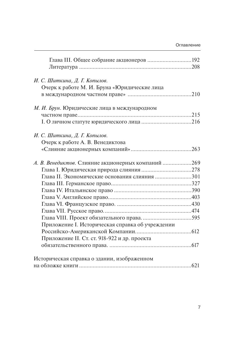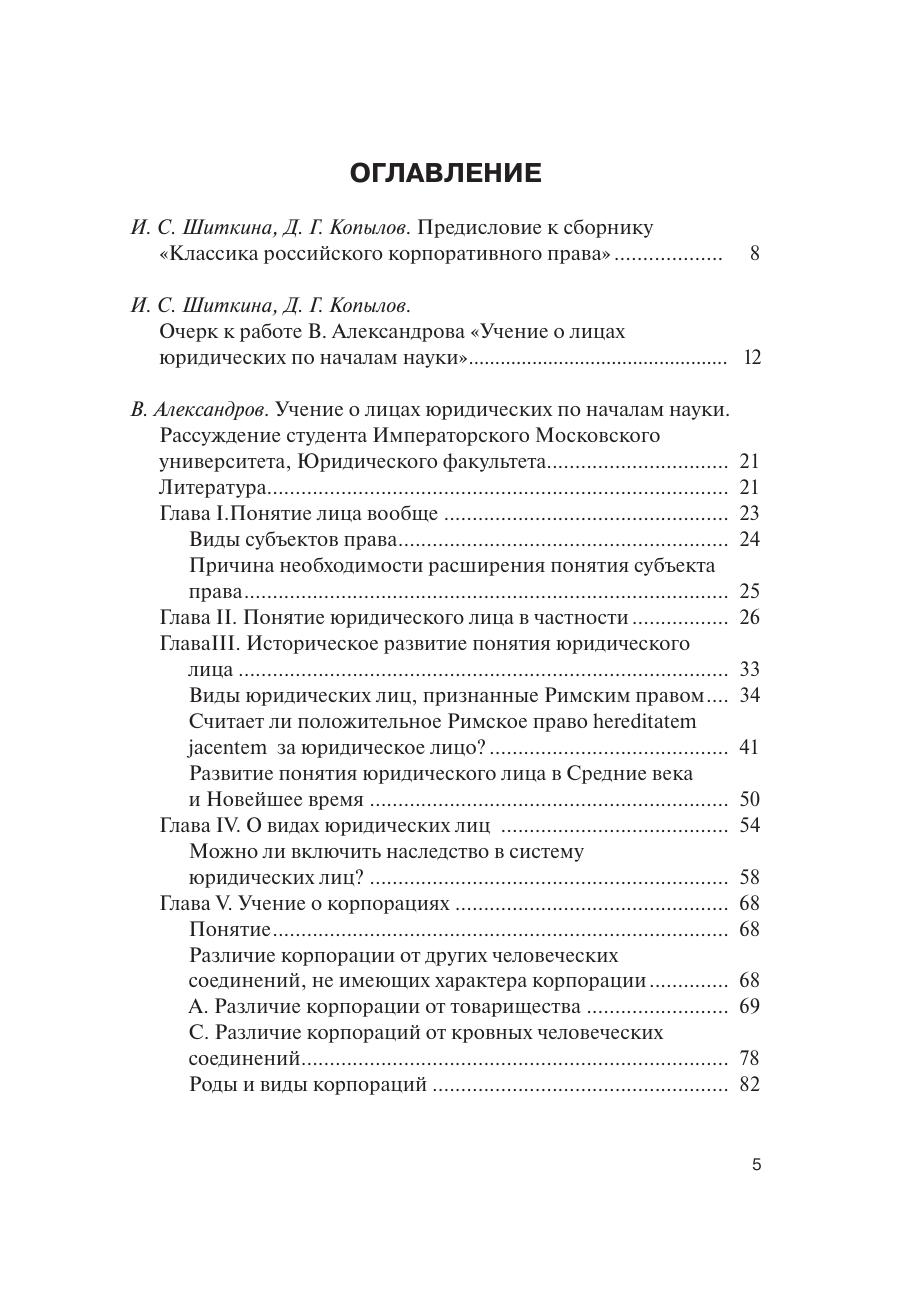 В первый том сборника «Классика российского корпоративного права» включены труды следующих дореволюционных ученых: В. Александрова, В.Е. Белинского, М.И. Бруна, А.В. Венедиктова. Каждой работе предпослан очерк, содержащий краткую биографическую справку об авторе, а также комментарий основных идей работы.