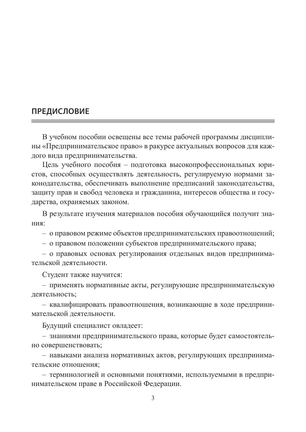В учебном пособии в соответствии с программой дисциплины «Предпринимательское право» на основе анализа норм действующего законодательства Российской Федерации рассмотрены проблемы ряда областей предпринимательской деятельности. Четкая структура пособия позволит студентам хорошо ориентироваться вотдельных видах предпринимательства, проводить сравнение между ними, отмечать проблемы и пути их решения. Материал пособия может быть использован в обучении по направлению подготовки 40.03.01 «Юриспруденция» (квалификация: бакалавр).
