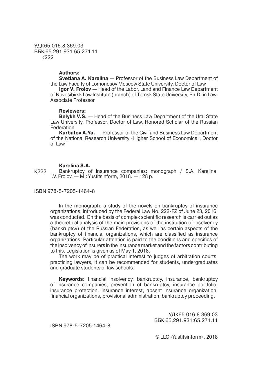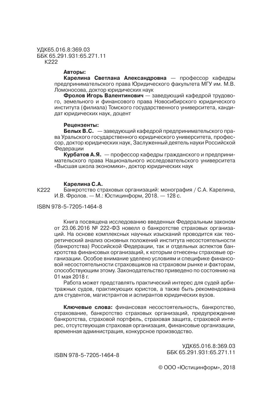 Книга посвящена исследованию введенных Федеральным законом от 23.06.2016 № 222-ФЗ новелл о банкротстве страховых организаций. На основе комплексных научных изысканий проводится как теоретический анализ основных положений института несостоятельности (банкротства) Российской Федерации, так и отдельных аспектов банкротства финансовых организаций, к которым отнесены страховые организации. Особое внимание уделено условиям и специфике финансовой несостоятельности страховщиков на страховом рынке и факторам, способствующим этому. Законодательство приведено по состоянию на 01 мая 2018 г.