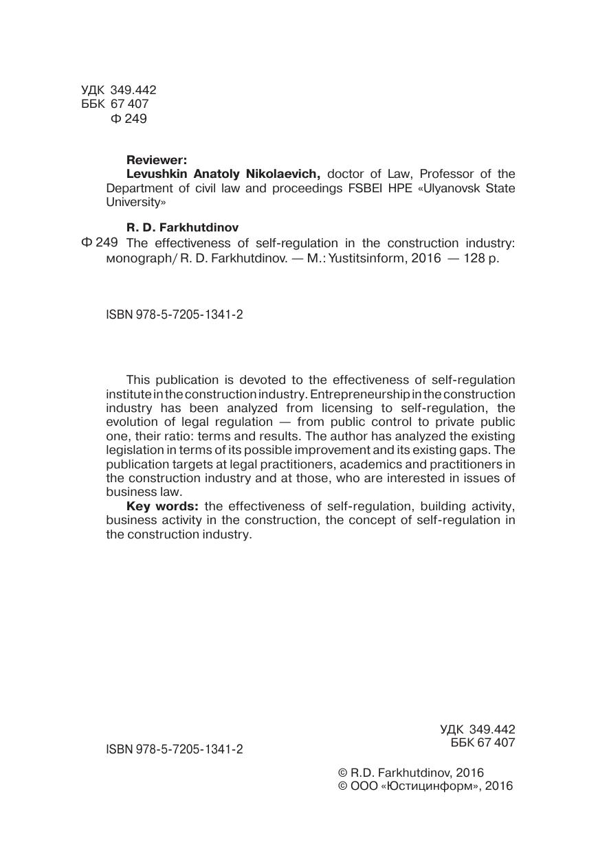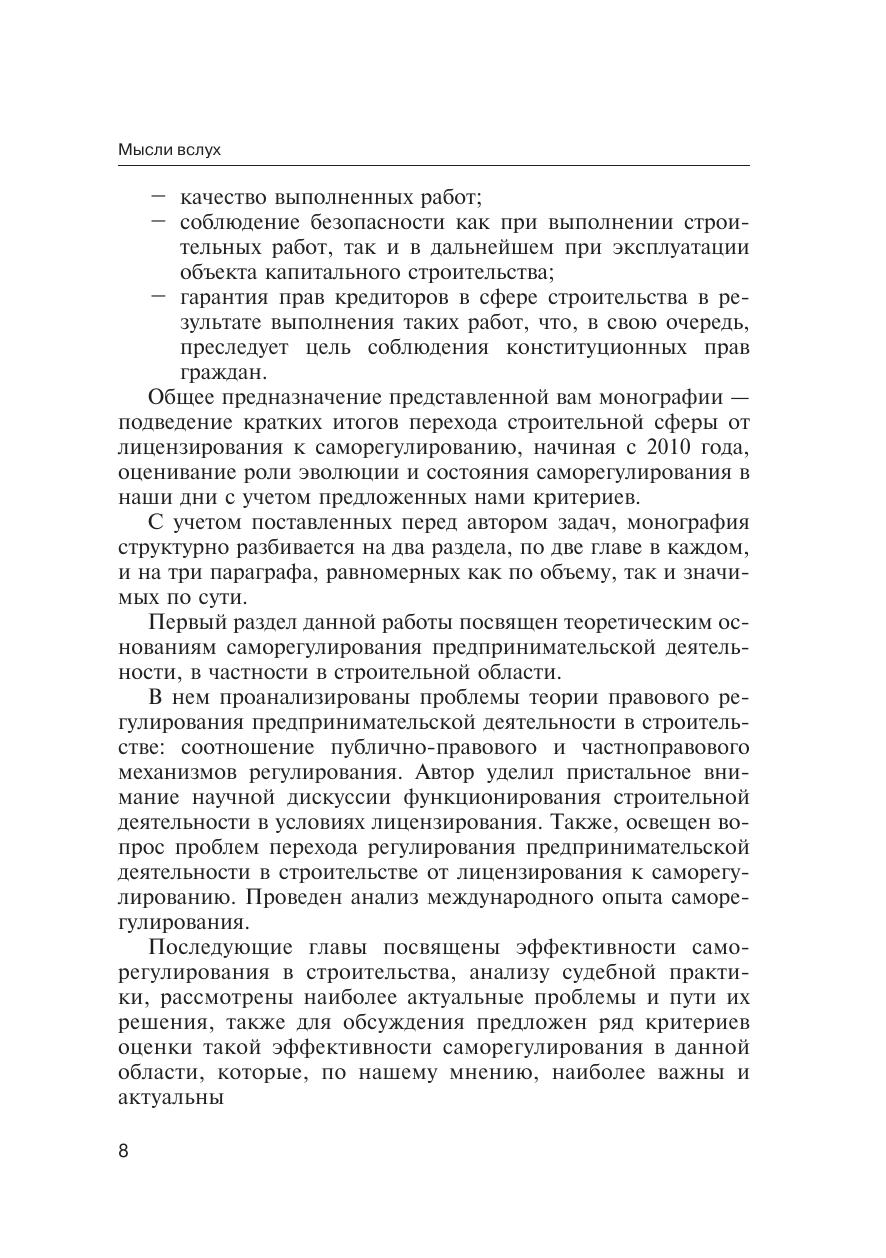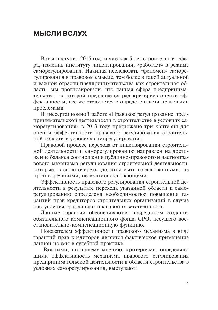 Настоящая книга посвящена вопросам эффективности института саморегулирования в строительной сфере. Проанализирована предпринимательская деятельность в сфере строительства от лицензирования к саморегулированию, эволюция правового регулирования — от публичного к публично-частному регулированию, их соотношение: условия и результат. Автор проанализировал действующее законодательство с точки зрения его возможного совершенствования и существующих пробелов. Книга рассчитана на практикующих юристов, научных работников и практиков в строительной сфере и всех интересующихся проблемами предпринимательского права.