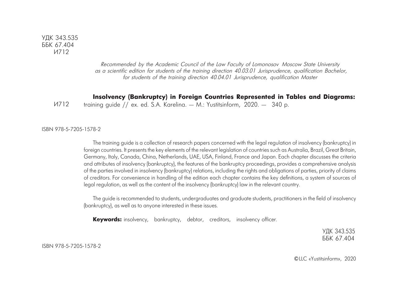 Учебное издание представляет собой сборник работ, посвященных правовому регулированию несостоятельности (банкротства) в зарубежных странах. В частности, рассматриваются ключевые элементы института несостоятельности (банкротства) Австралии, Бразилии, Великобритании, Германии, Италии, Канады, Китая, Нидерландов, ОАЭ, США, Финляндии, Франции и Японии. В каждой главе рассмотрены критерии и признаки несостоятельности (банкротства), особенности самих процедур, приведен комплексный анализ субъектного состава правоотношений несостоятельности (банкротства), включая права и обязанности участников, очередность удовлетворения требований кредиторов. Для удобства работы с изданием каждая глава включает в себя ключевой понятийный аппарат, систему источников правового регулирования, а также содержание закона о несостоятельности (банкротства) в определенной стране.