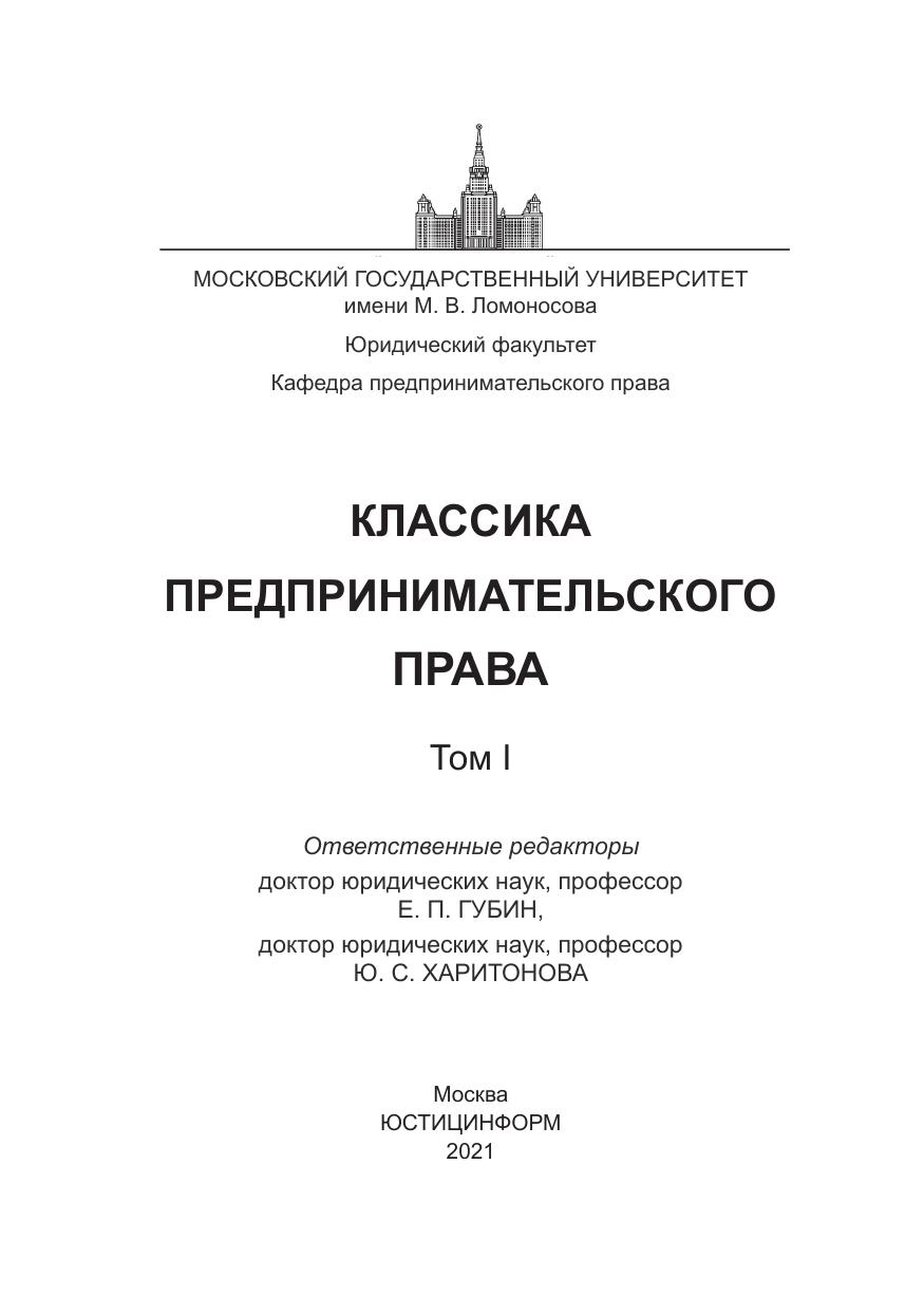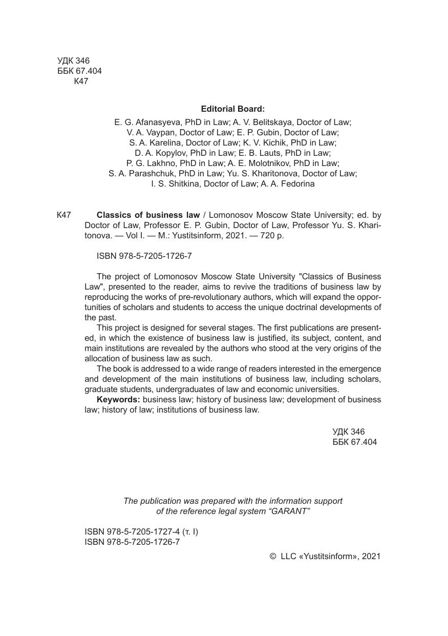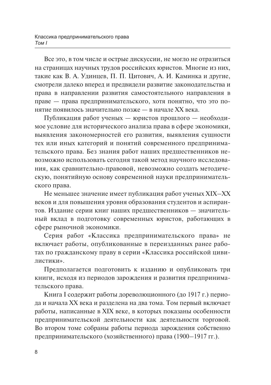 Представленный вниманию читателя проект МГУ имени М. В. Ломоносова «Классика предпринимательского права» ставит своей целью возрождение традиций предпринимательского права путем воспроизведения работ дореволюционных авторов, что позволит расширить возможности ученых и студентов для доступа к уникальным доктринальным наработкам прошлого. Данный проект рассчитан на несколько этапов. Первыми представлены публикации, в которых обосновывается существование предпринимательского права, раскрывается его предмет, содержание, основные институты авторами, стоявшими у самых истоков выделения предпринимательского права как такового. Книга адресована широкому кругу читателей, интересующихся проблемами возникновения и развития основных институтов предпринимательского права, в том числе учёным, аспирантам, магистрантам юридических и экономических вузов.