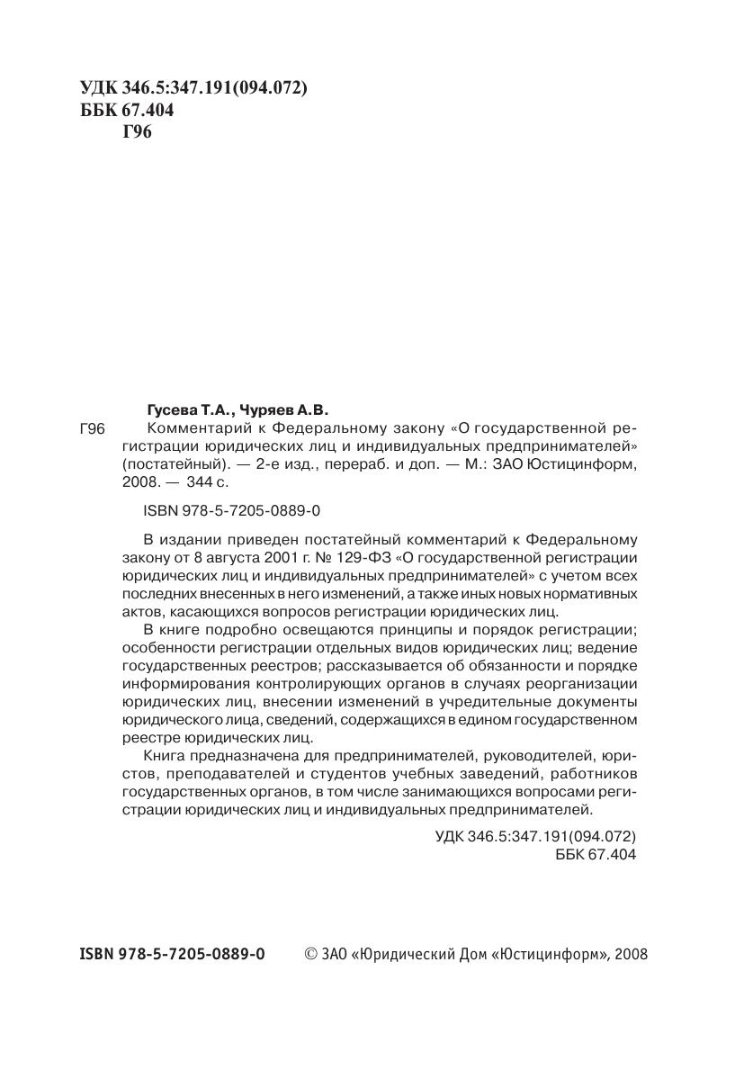 В издании приведен постатейный комментарий к Федеральному закону от 8 августа 2001 г. № 129-ФЗ «О государственной регистрации юридических лиц и индивидуальных предпринимателей» с учетом всех последних внесенных в него изменений, а также иных новых нормативных актов, касающихся вопросов регистрации юридических лиц.В книге подробно освещаются принципы и порядок регистрации особенности регистрации отдельных видов юридических лиц ведение государственных реестров рассказывается об обязанности и порядке информирования контролирующих органов в случаях реорганизации юридических лиц, внесении изменений в учредительные документы юридического лица, сведений, содержащихся в едином государственном реестре юридических лиц.Книга предназначена для предпринимателей, руководителей, юристов, преподавателей и студентов учебных заведений, работников государственных органов, в том числе занимающихся вопросами регистрации юридических лиц и индивидуальных предпринимателей.