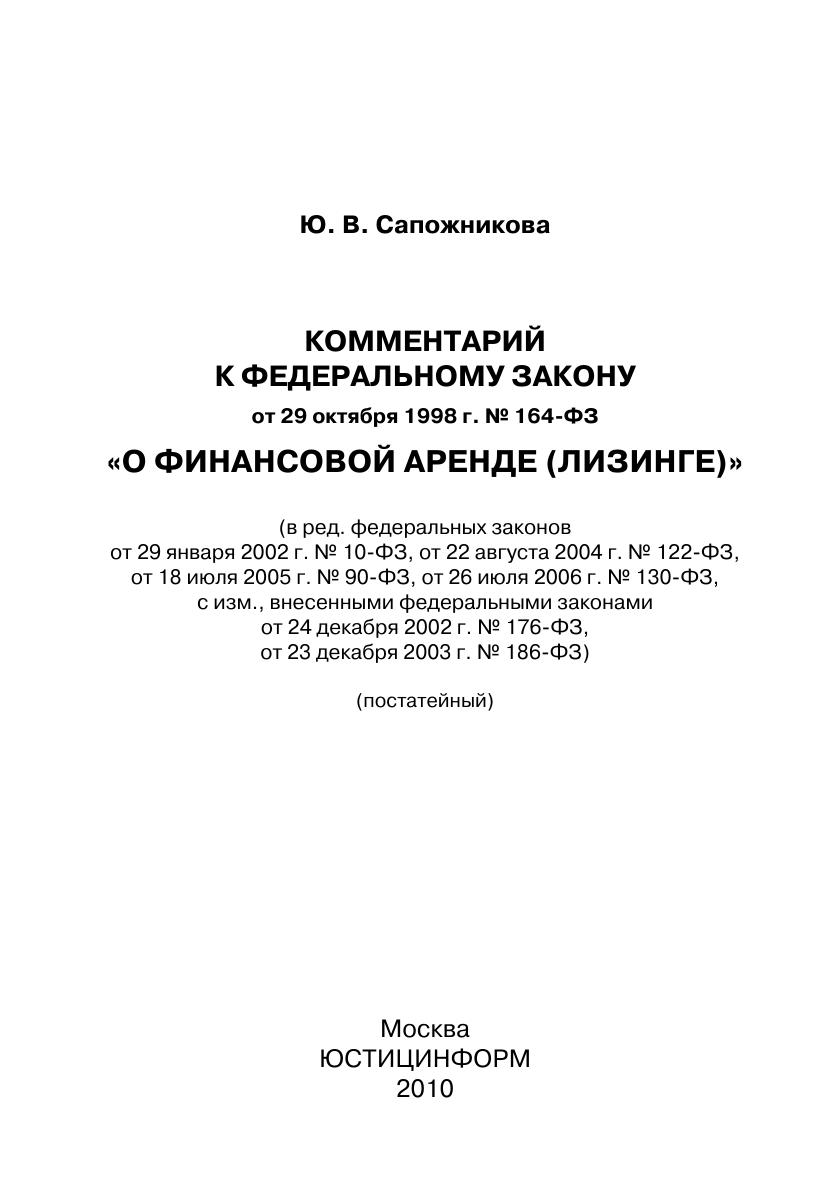 Комментарий к Федеральному закону от 29 октября 1998 г. № 164-ФЗ «О финансовой аренде (лизинге)» (постатейный)