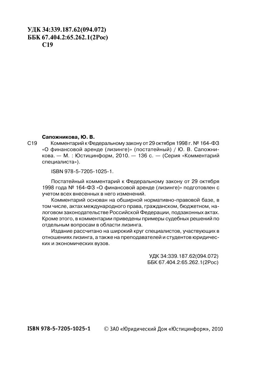 Постатейный комментарий к Федеральному закону от 29 октября 1998 года № 164-ФЗ «О финансовой аренде (лизинге)» подготовлен с учетом всех внесенных в него изменений.Комментарий основан на обширной нормативно-правовой базе, в том числе, актах международного права, гражданском, бюджетном, налоговом законодательстве Российской Федерации, подзаконных актах. Кроме этого, в комментарии приведены примеры судебных решений по отдельным вопросам в области лизинга. Издание рассчитано на широкий круг специалистов, участвующих в отношениях лизинга, а также на преподавателей и студентов юридических и экономических вузов.