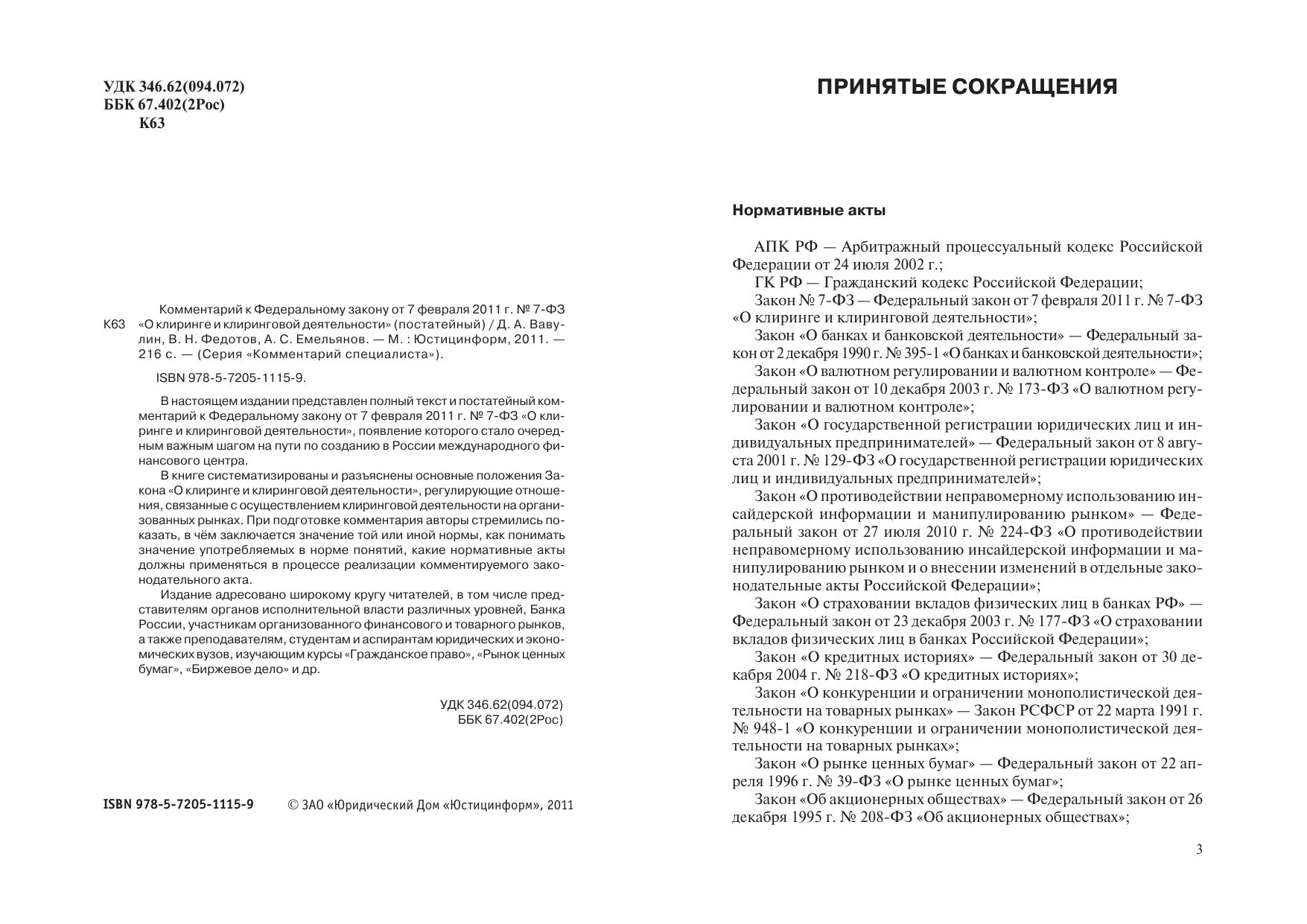 В настоящем издании представлен полный текст и постатейный комментарий к Федеральному закону от 7 февраля 2011 г. № 7-ФЗ «О клиринге и клиринговой деятельности», появление которого стало очередным важным шагом на пути по созданию в России международного финансового центра. В книге систематизированы и разъяснены основные положения Закона «О клиринге и клиринговой деятельности», регулирующие отношения, связанные с осуществлением клиринговой деятельности на организованных рынках. При подготовке комментария авторы стремились показать, в чём заключается значение той или иной нормы, как понимать значение употребляемых в норме понятий, какие нормативные акты должны применяться в процессе реализации комментируемого законодательного акта.