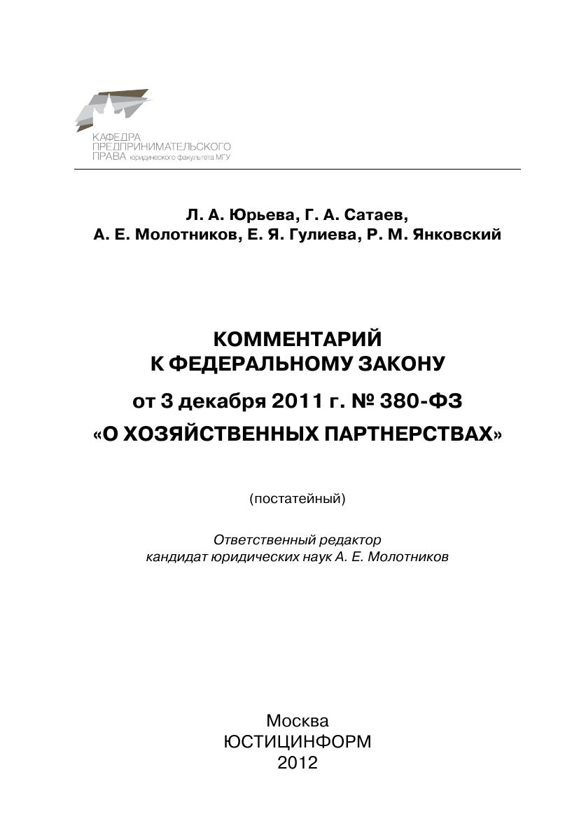 Комментарий к Федеральному закону от 3 декабря 2011 г. № 380-ФЗ «О хозяйственных партнерствах» (постатейный)