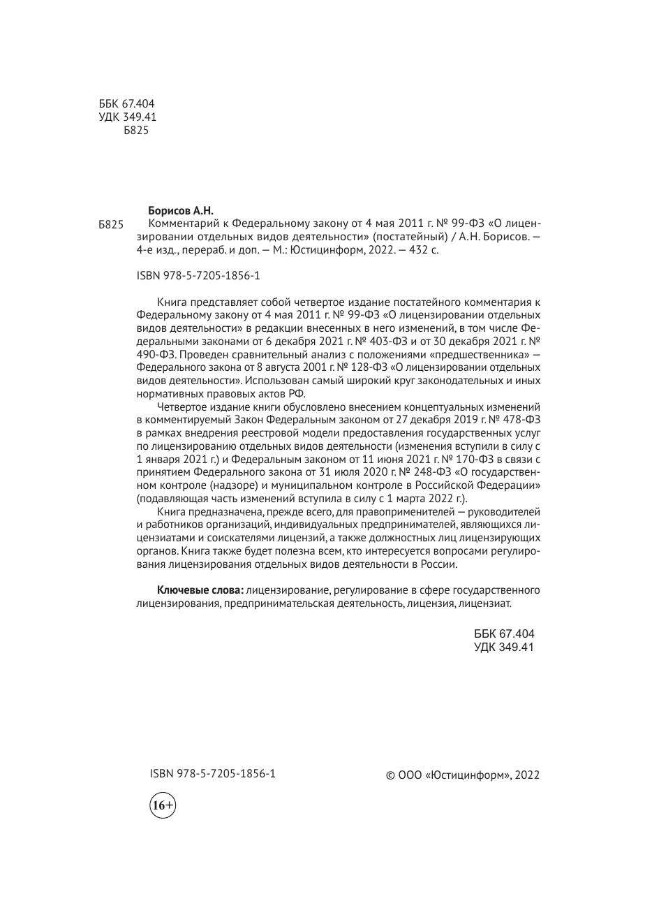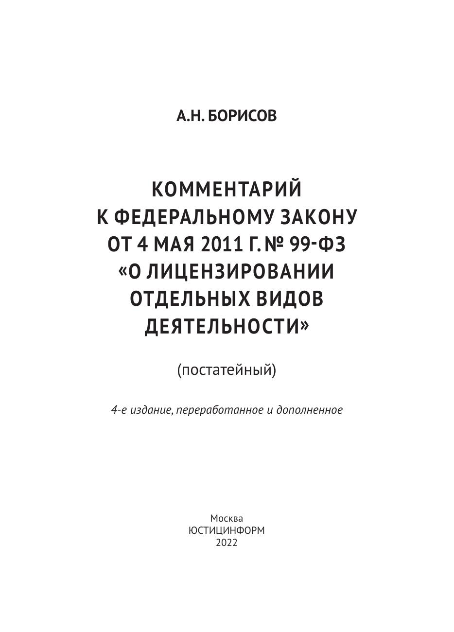 Книга представляет собой четвертое издание постатейного комментария к Федеральному закону от 4 мая 2011 г. № 99-ФЗ «О лицензировании отдельных видов деятельности» в редакции внесенных в него изменений, в том числе Федеральными законами от 6 декабря 2021 г. № 403-ФЗ и от 30 декабря 2021 г. № 490-ФЗ. Проведен сравнительный анализ с положениями «предшественника» — Федерального закона от 8 августа 2001 г. № 128-ФЗ «О лицензировании отдельных видов деятельности». Использован самый широкий круг законодательных и иных нормативных правовых актов РФ. Четвертое издание книги обусловлено внесением концептуальных изменений в комментируемый Закон Федеральным законом от 27 декабря 2019 г. № 478-ФЗ