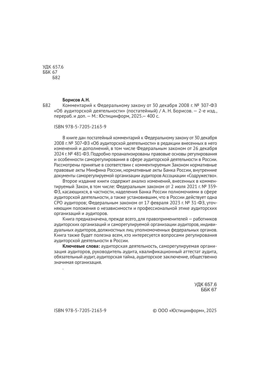 В книге дан постатейный комментарий к Федеральному закону от 30 декабря 2008 г. № 307-ФЗ «Об аудиторской деятельности» в редакции внесенных в него изменений и дополнений, в том числе Федеральным законом от 26 декабря 2024 г. № 481-ФЗ. Подробно проанализированы правовые основы регулирования и особенности саморегулирования в сфере аудиторской деятельности в России. Рассмотрены принятые в соответствии с комментируемым Законом нормативные правовые акты Минфина России, нормативные акты Банка России, внутренние документы саморегулируемой организации аудиторов Ассоциации «Содружество». Второе издание книги содержит анализ изменений, внесенных в комментируемый Закон, в том числе: Федеральным законом от 2 июля 2021 г. № 359-ФЗ, касающихся, в частности, наделения Банка России полномочиями в сфере аудиторской деятельности, а также установившим, что в России действует одна СРО аудиторов; Федеральным законом от 17 февраля 2023 г. № 31-ФЗ, уточняющим положения о независимости и профессиональной этике аудиторских организаций и аудиторов. Книга предназначена, прежде всего, для правоприменителей — работников аудиторских организаций и саморегулируемой организации аудиторов, индивидуальных аудиторов, должностных лиц уполномоченных федеральных органов. Книга также будет полезна всем, кто интересуется вопросами регулирования аудиторской деятельности в России.