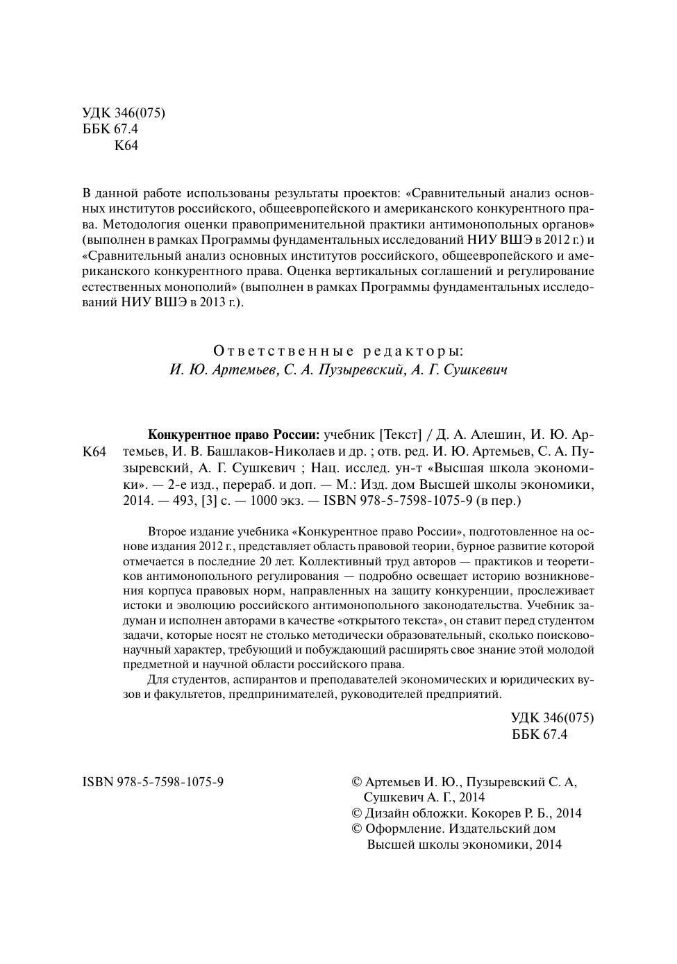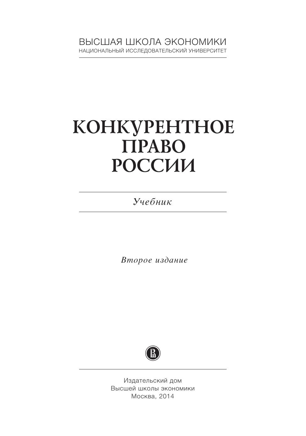 Второе издание учебника «Конкурентное право России», подготовленное на основе издания 2012 г., представляет область правовой теории, бурное развитие которой отмечается в последние 20 лет. Коллективный труд авторов — практиков и теоретиков антимонопольного регулирования — подробно освещает историю возникновения корпуса правовых норм, направленных на защиту конкуренции, прослеживает истоки и эволюцию российского антимонопольного законодательства. Учебник задуман и исполнен авторами в качестве «открытого текста», он ставит перед студентом задачи, которые носят не столько методически образовательный, сколько поисково-научный характер, требующий и побуждающий расширять свое знание этой молодой предметной и научной области российского права. Для студентов, аспирантов и преподавателей экономических и юридических вузов и факультетов, предпринимателей, руководителей предприятий.
