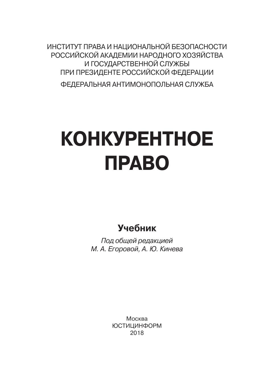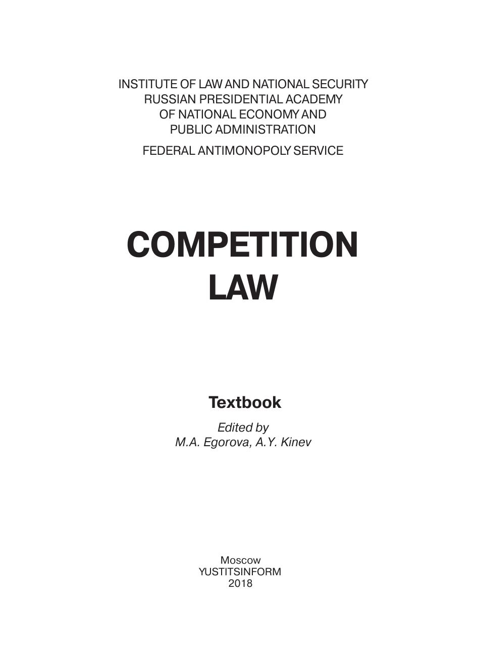 Учебник подготовлен сотрудниками Федеральной антимонопольной службы и ведущими научными специалистами в области антимонопольного регулирования. В настоящем учебнике даны определения конкурентного права, предмета и метода правового регулирования, система источников и правовой статус субъектов конкурентного права. Авторами проанализирована правоприменительная и судебная практика применения антимонопольного законодательства, освещены запреты, предусмотренные конкурентным правом, а также раскрыт институт юридической ответственности. Впервые введено понятие антимонопольного процесса, раскрыты его стадии и участники. Дана характеристика основным положениям антимонопольного регулирования в рамках деятельности Евразийского экономического союза.