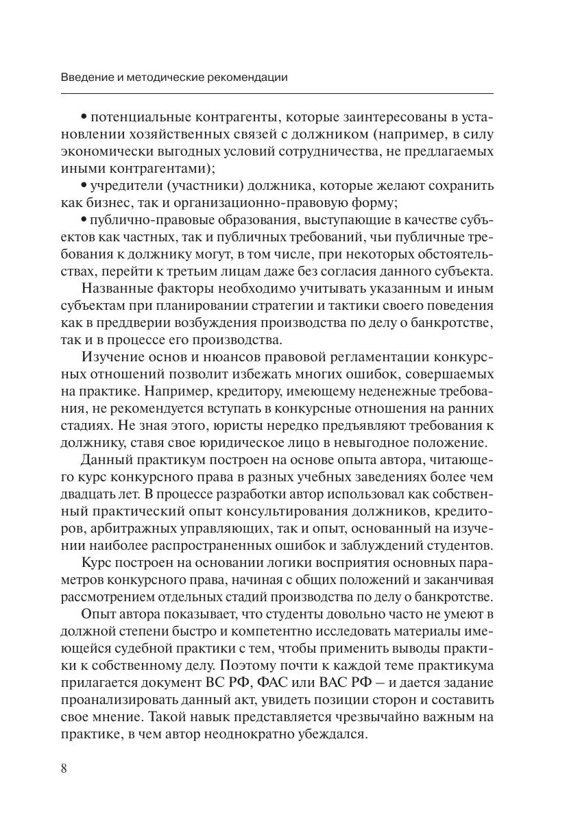 Настоящий практикум – не только учебное пособие для студентов, бакалавров, магистров, аспирантов, арбитражных управляющих, но и материал для самопроверки практикующих юристов. Чем выше уровень мышления – юридического вообще и конкурсно-правового в частности, – тем больше вопросов и проблем по каждой задаче возникнет.