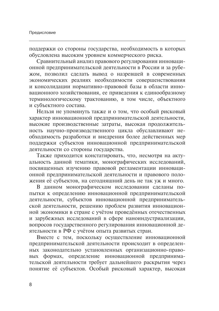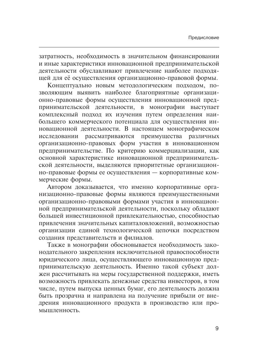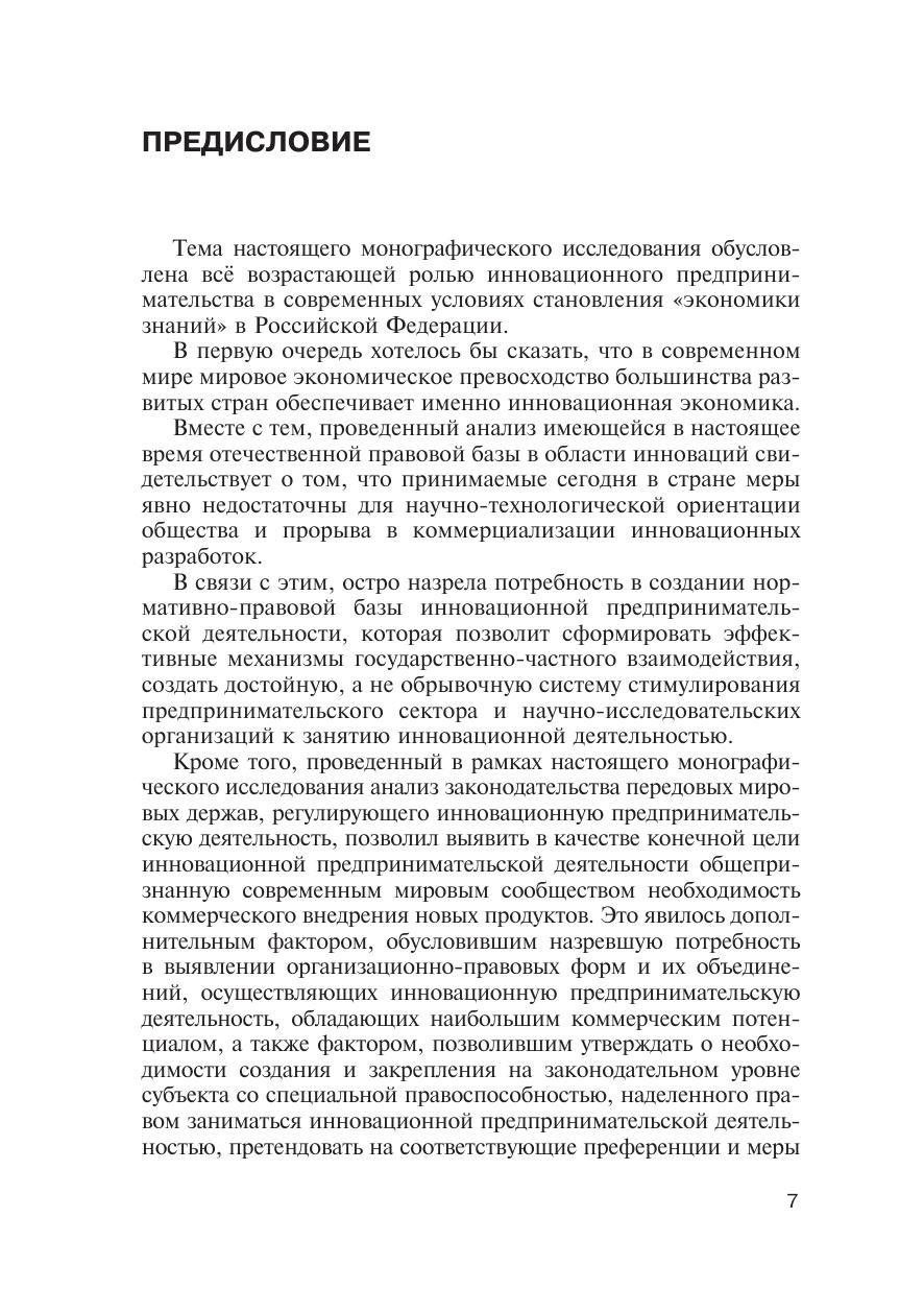 Автор монографии надеется, что предлагаемое исследование будет в какой-то мере использовано в правотворческом процессе создания и совершенствования действующего гражданского законодательства, обеспечивающего предпринимательскую деятельность субъектов инновационной экономики РФ.