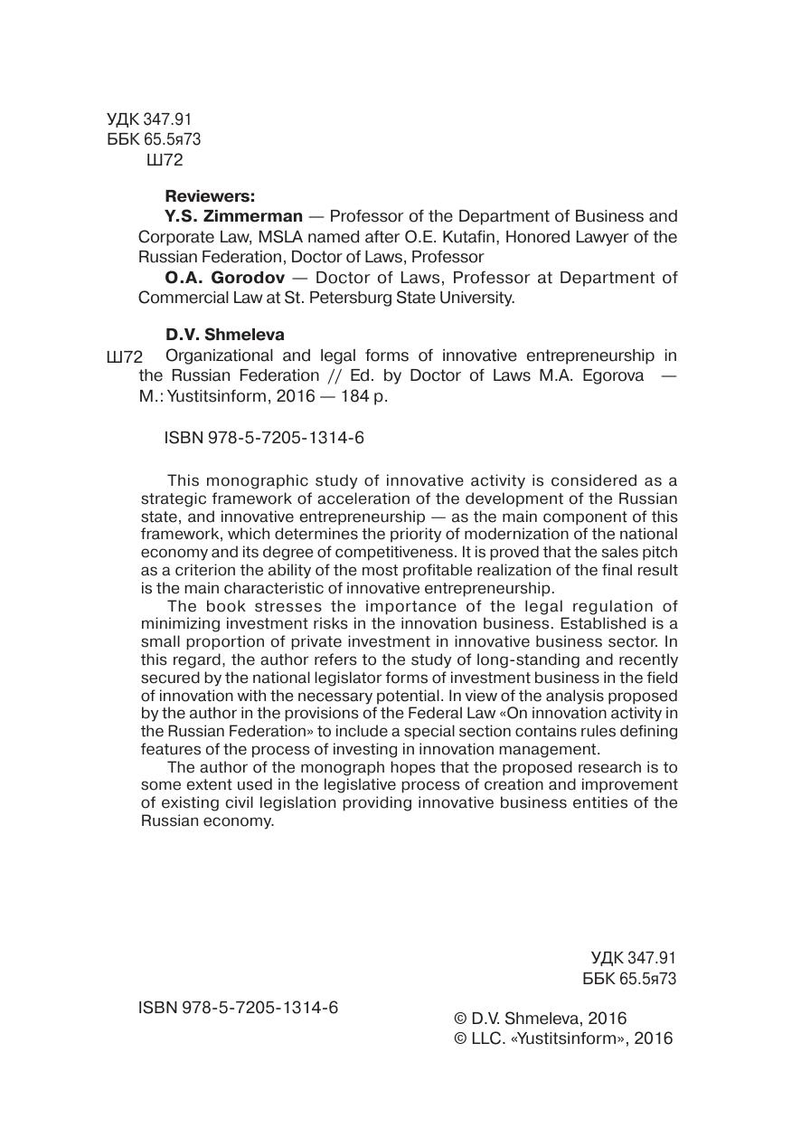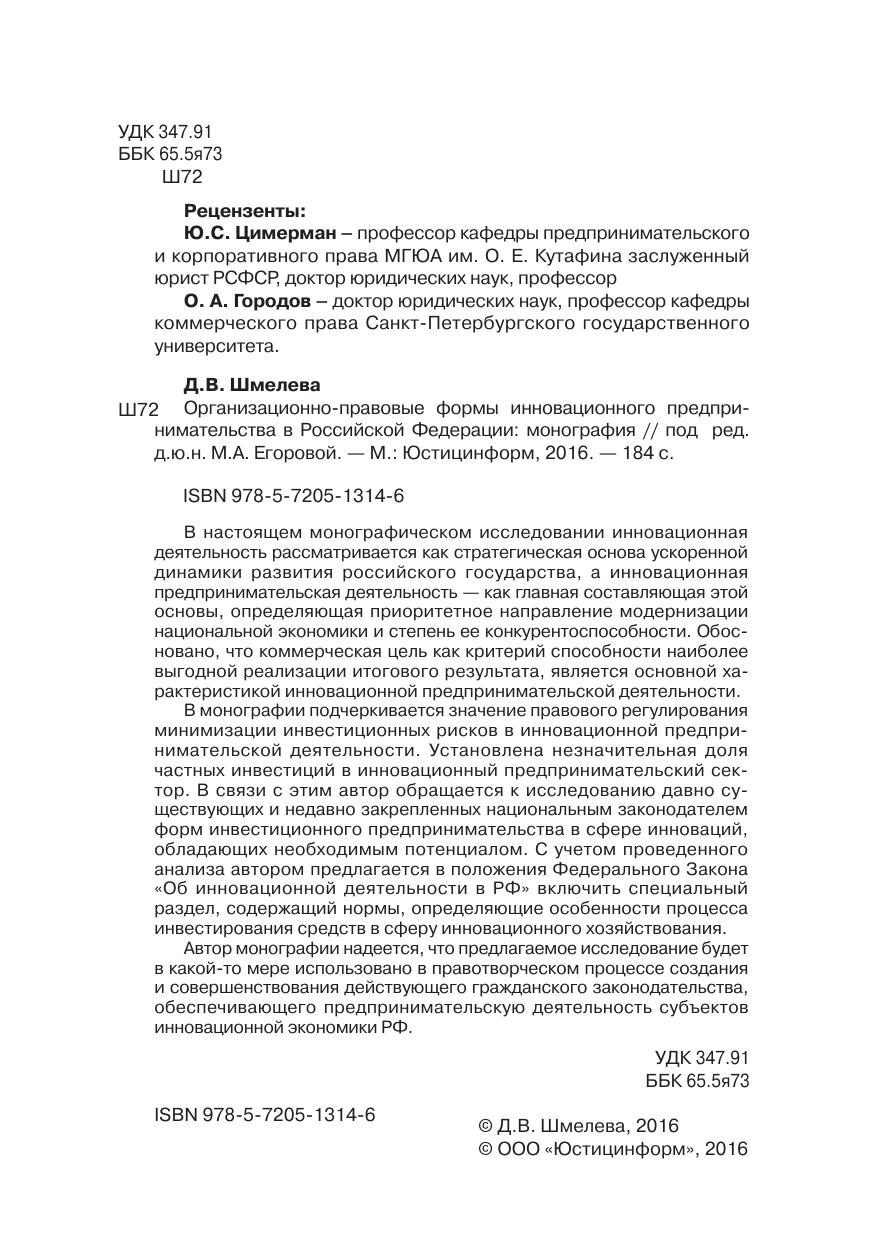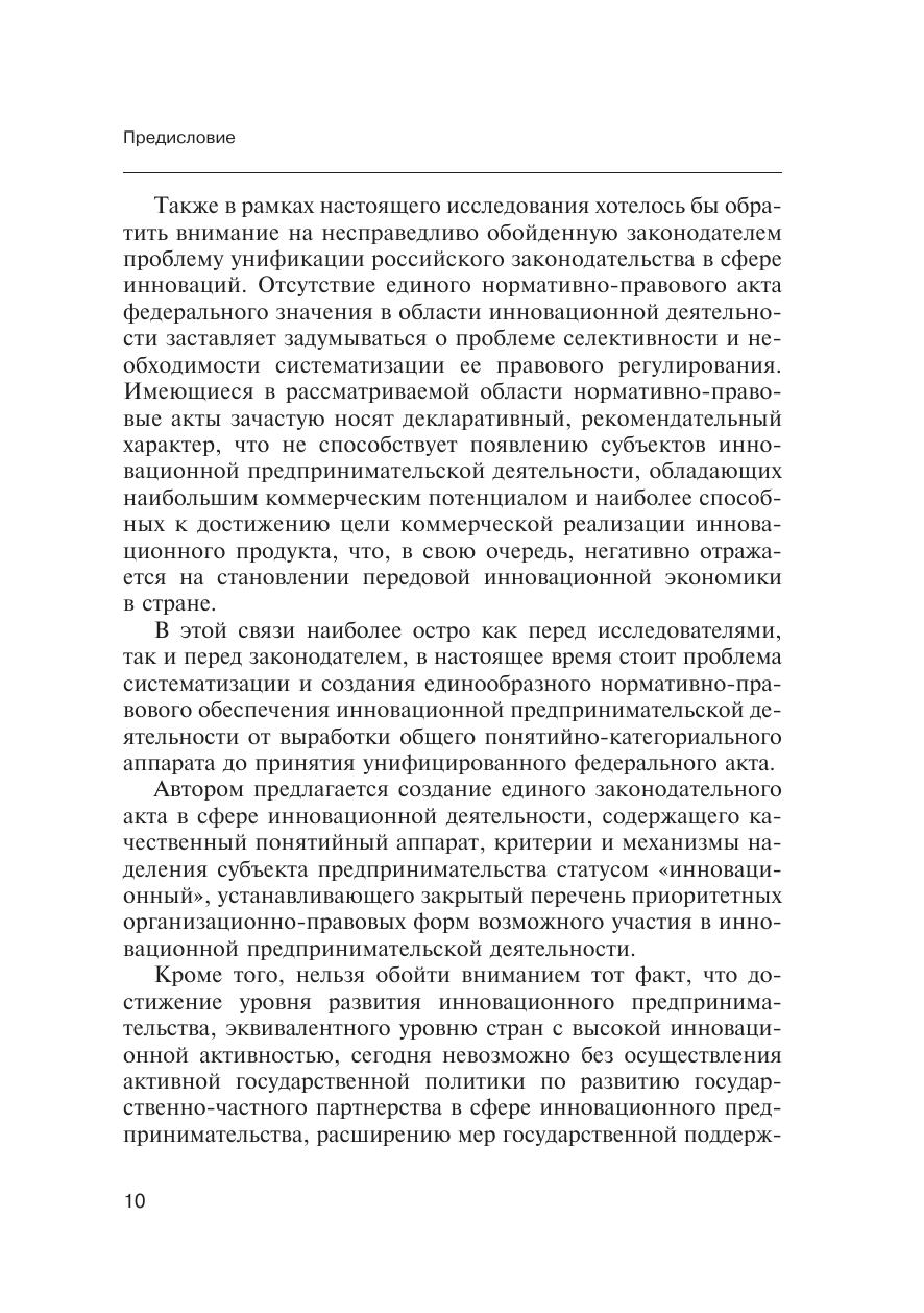 Автор монографии надеется, что предлагаемое исследование будет в какой-то мере использовано в правотворческом процессе создания и совершенствования действующего гражданского законодательства, обеспечивающего предпринимательскую деятельность субъектов инновационной экономики РФ.
