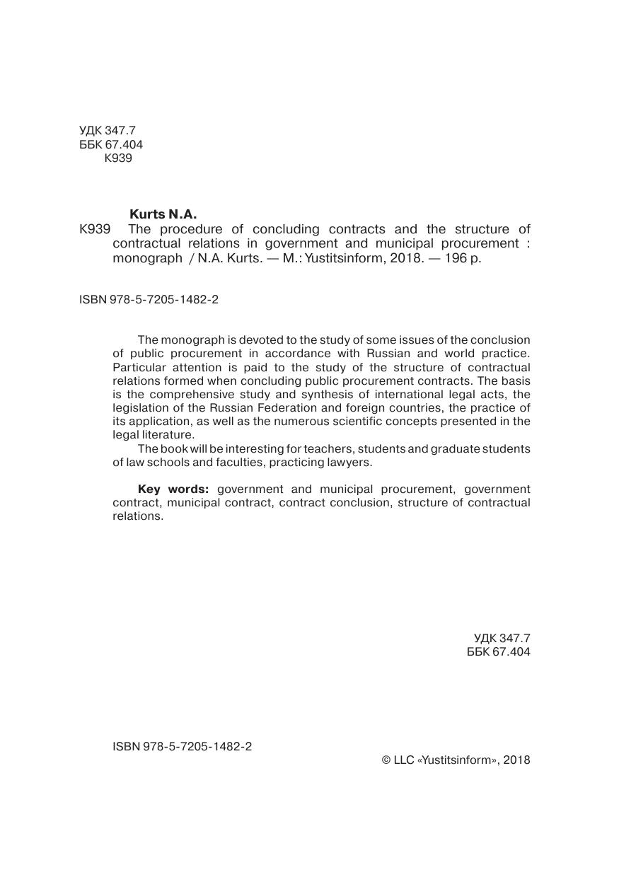 Монография посвящена исследованию круга вопросов, связанных с заключением договоров о государственных и муниципальных закупках товаров, работ и услуг в соответствии с российской и мировой практикой. Особое внимание уделено изучению структуры договорных связей, образующихся при заключении договоров о государственных и муниципальных закупках. В основу легло всестороннее изучение и обобщение международных правовых актов, национального законодательства Российской Федерации и зарубежных стран, практики его применения, а также многочисленных научных концепций, представленных в юридической литературе.