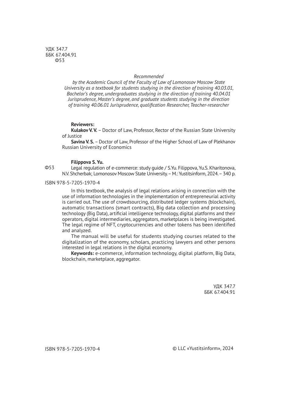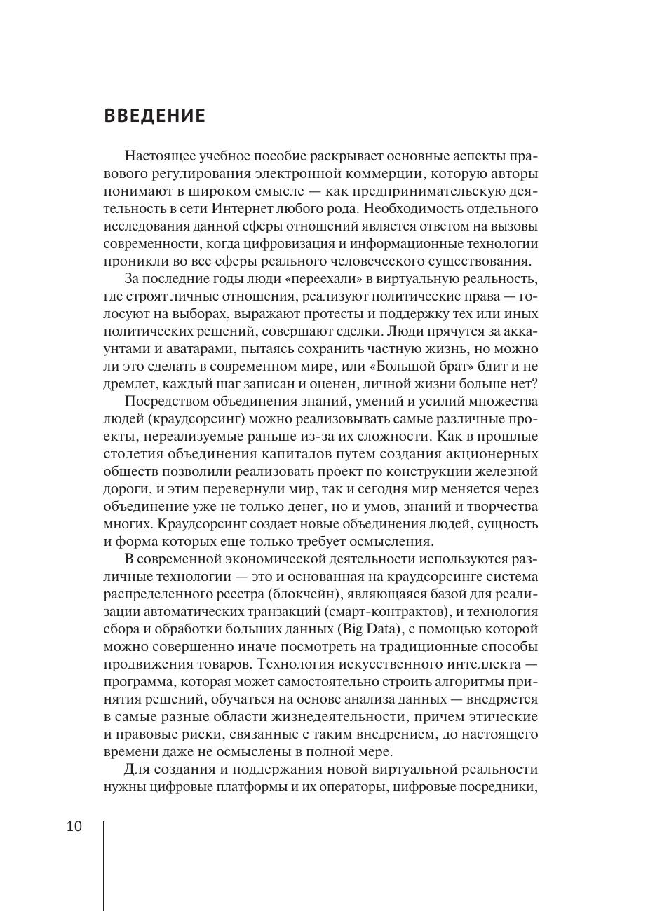 В настоящем учебном пособии проведен анализ правоотношений, возникающих в связи с использованием информационных технологий при осуществлении предпринимательской деятельности. Исследуется использование краудсорсинга, системы распределенного реестра (блокчейн), автоматических транзакций (смарт-контрактов), технология сбора и обработки больших данных (Big Data), технология искусственного интеллекта, цифровые платформы и их операторы, цифровые посредники, агрегаторы, маркетплейсы. Выявлен и проанализирован правовой режим NFT, криптовалюты и иных токенов. Пособие будет полезно студентам при изучении учебных курсов, связанных с цифровизацией экономики, ученым, практикующим юристам и иным лицам, интересующимся правовыми отношениями в цифровой экономике.