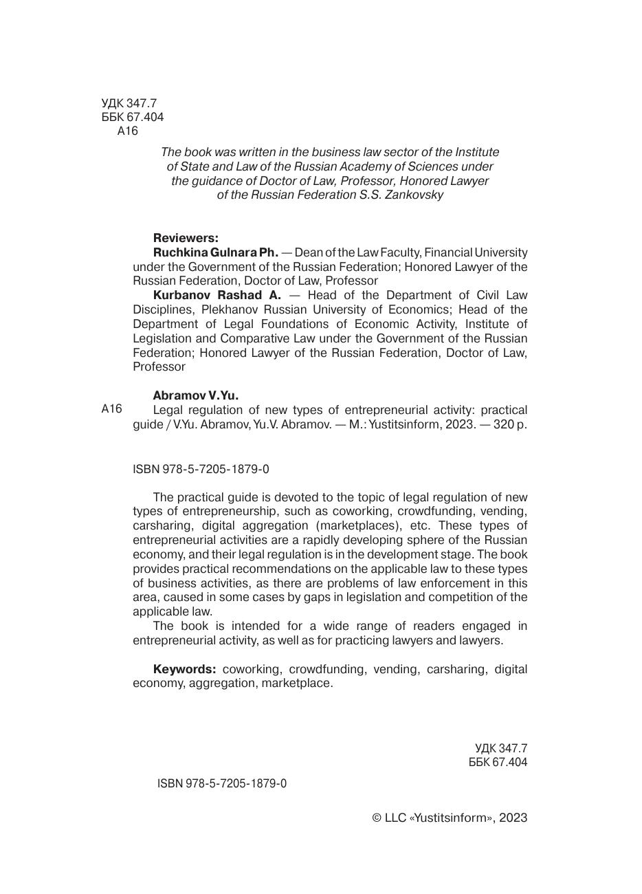 Практическое пособие посвящено теме правового регулирования новых видов предпринимательства, таких как коворкинг, краудфандинг, вендинг, каршеринг, цифровое агрегирование (маркетплейсы) и т.п. Эти виды предпринимательской деятельности являются быстроразвивающейся сферой экономики России, а их правовое регулирование находится в стадии развития. В книге даны практические рекомендации по применимому праву к данным видам предпринимательской деятельности, так как в этой области существуют проблемы правоприменения, обусловленные в ряде случаев пробелами в законодательстве и конкуренцией норм применимого права. Книга предназначена для широкого круга читателей, занятых