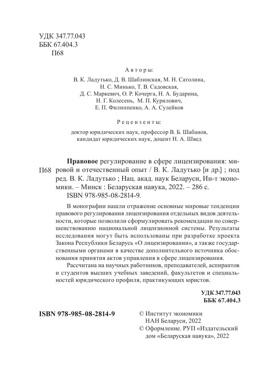 В монографии нашли отражение основные мировые тенденции правового регулирования лицензирования отдельных видов деятельности, которые позволили сформулировать рекомендации по совершенствованию национальной лицензионной системы. Результаты исследования могут быть использованы при разработке проекта Закона Республики Беларусь «О лицензировании», а также государственными органами в качестве дополнительного источника обоснования принятия актов управления в сфере лицензирования.