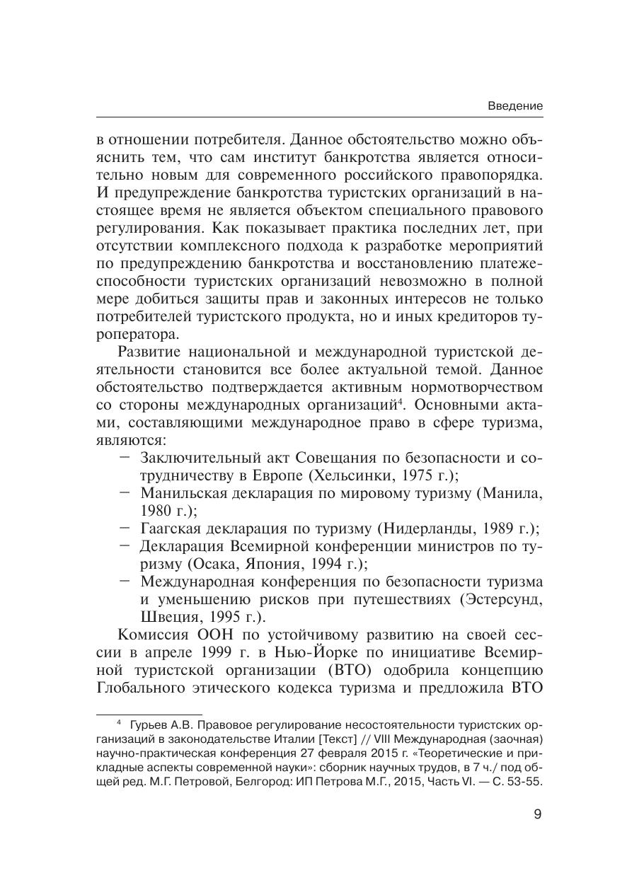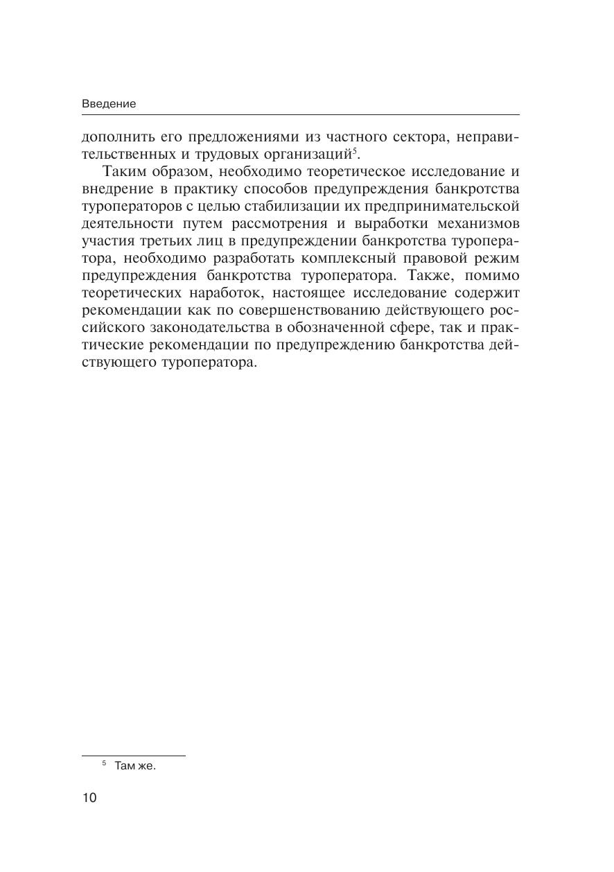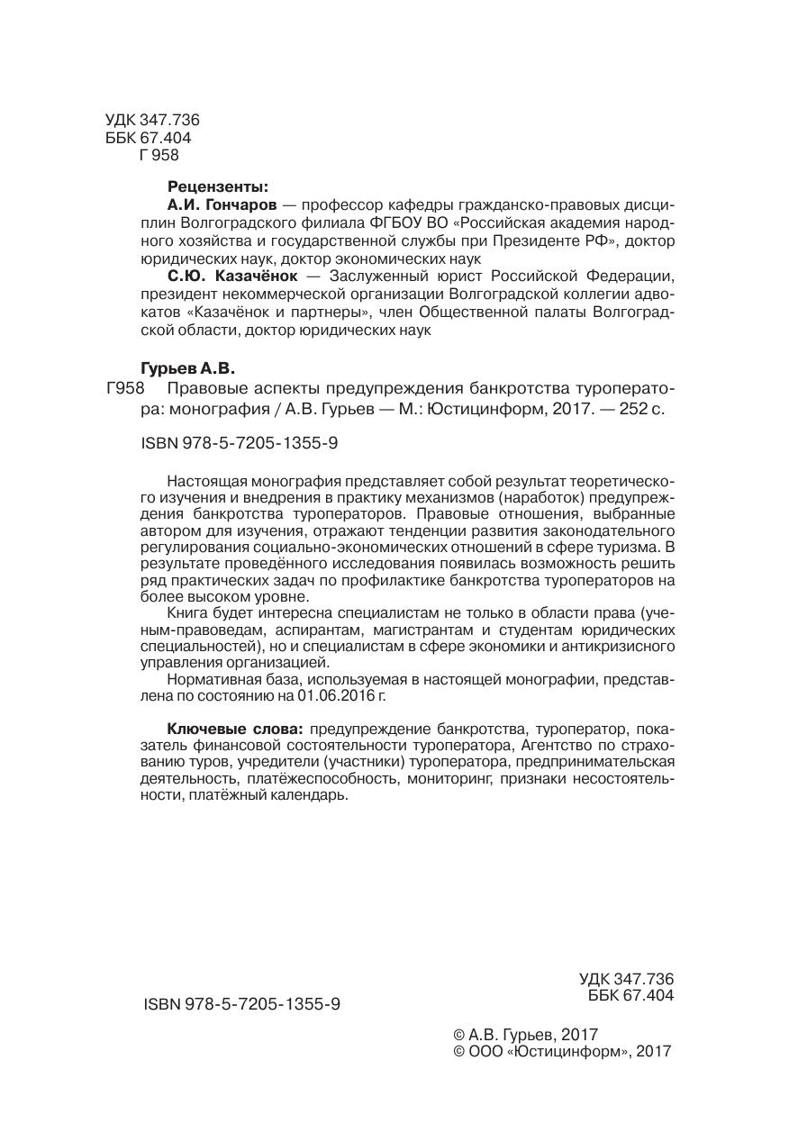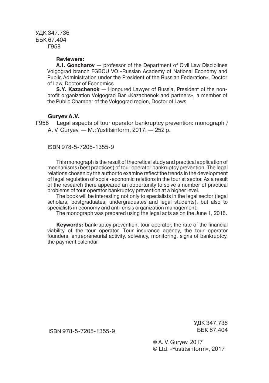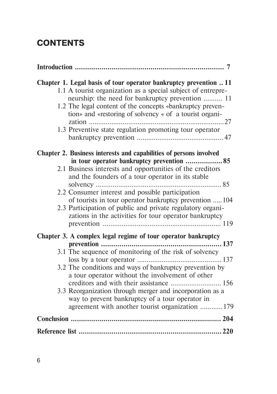 Настоящая монография представляет собой результат теоретического изучения и внедрения в практику механизмов (наработок) предупреждения банкротства туроператоров. Правовые отношения, выбранные автором для изучения, отражают тенденции развития законодательного регулирования социально-экономических отношений в сфере туризма. В результате проведённого исследования появилась возможность решить ряд практических задач по профилактике банкротства туроператоров на более высоком уровне. Книга будет интересна специалистам не только в области права (ученым-правоведам, аспирантам, магистрантам и студентам юридических специальностей), но и специалистам в сфере экономики и антикризисного управления организацией. Нормативная база, используемая в настоящей монографии, представлена по состоянию на 01.06.2016.