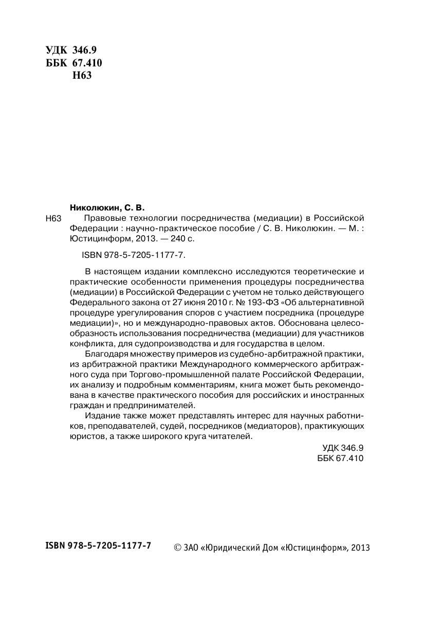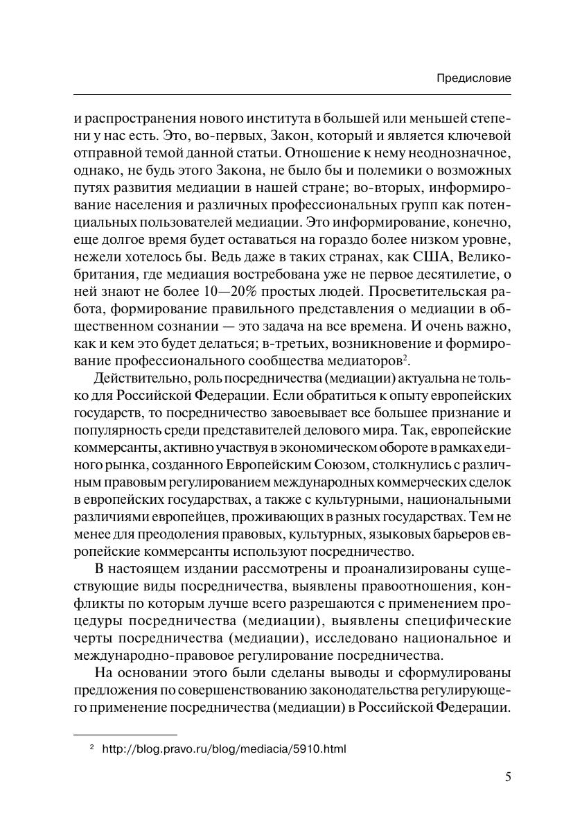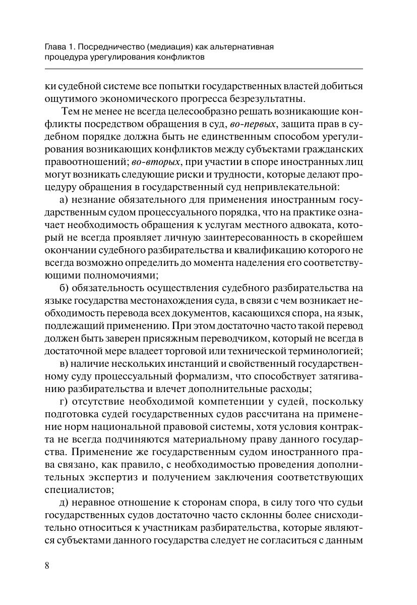 В настоящем издании комплексно исследуются теоретические и практические особенности применения процедуры посредничества (медиации) в Российской Федерации с учетом не только действующего Федерального закона от 27 июня 2010 г. № 193-ФЗ «Об альтернативной процедуре урегулирования споров с участием посредника (процедуре медиации)», но и международно-правовых актов. Обоснована целесообразность использования посредничества (медиации) для участников конфликта, для судопроизводства и для государства в целом.Благодаря множеству примеров из судебно-арбитражной практики, из арбитражной практики Международного коммерческого арбитражного суда при Торгово-промышленной палате Российской Федерации, их анализу и подробным комментариям, книга может быть рекомендована в качестве практического пособия для российских и иностранных граждан и предпринимателей.Издание также может представлять интерес для научных работников, преподавателей, судей, посредников (медиаторов), практикующих юристов, а также широкого круга читателей.