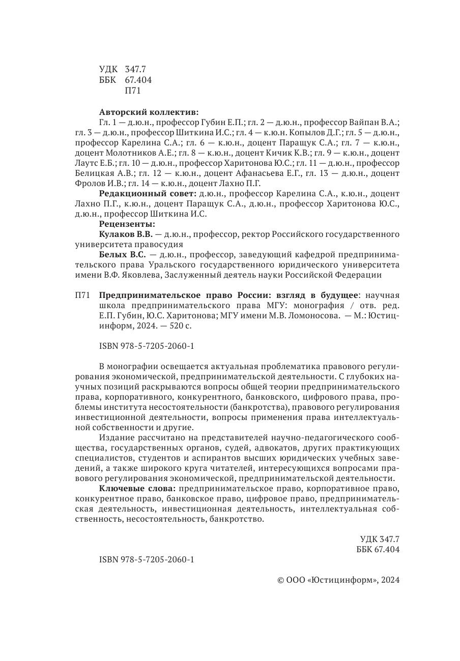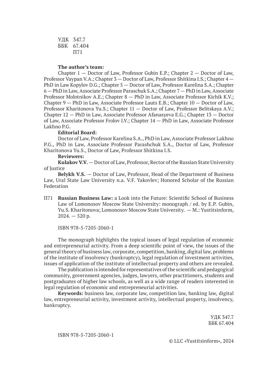 В монографии освещается актуальная проблематика правового регулирования экономической, предпринимательской деятельности. С глубоких научных позиций раскрываются вопросы общей теории предпринимательского права, корпоративного, конкурентного, банковского, цифрового права, проблемы института несостоятельности (банкротства), правового регулирования инвестиционной деятельности, вопросы применения права интеллектуальной собственности и другие. Издание рассчитано на представителей научно-педагогического сообщества, государственных органов, судей, адвокатов, других практикующих специалистов, студентов и аспирантов высших юридических учебных заведений, а также широкого круга читателей, интересующихся вопросами правового регулирования экономической, предпринимательской деятельности.