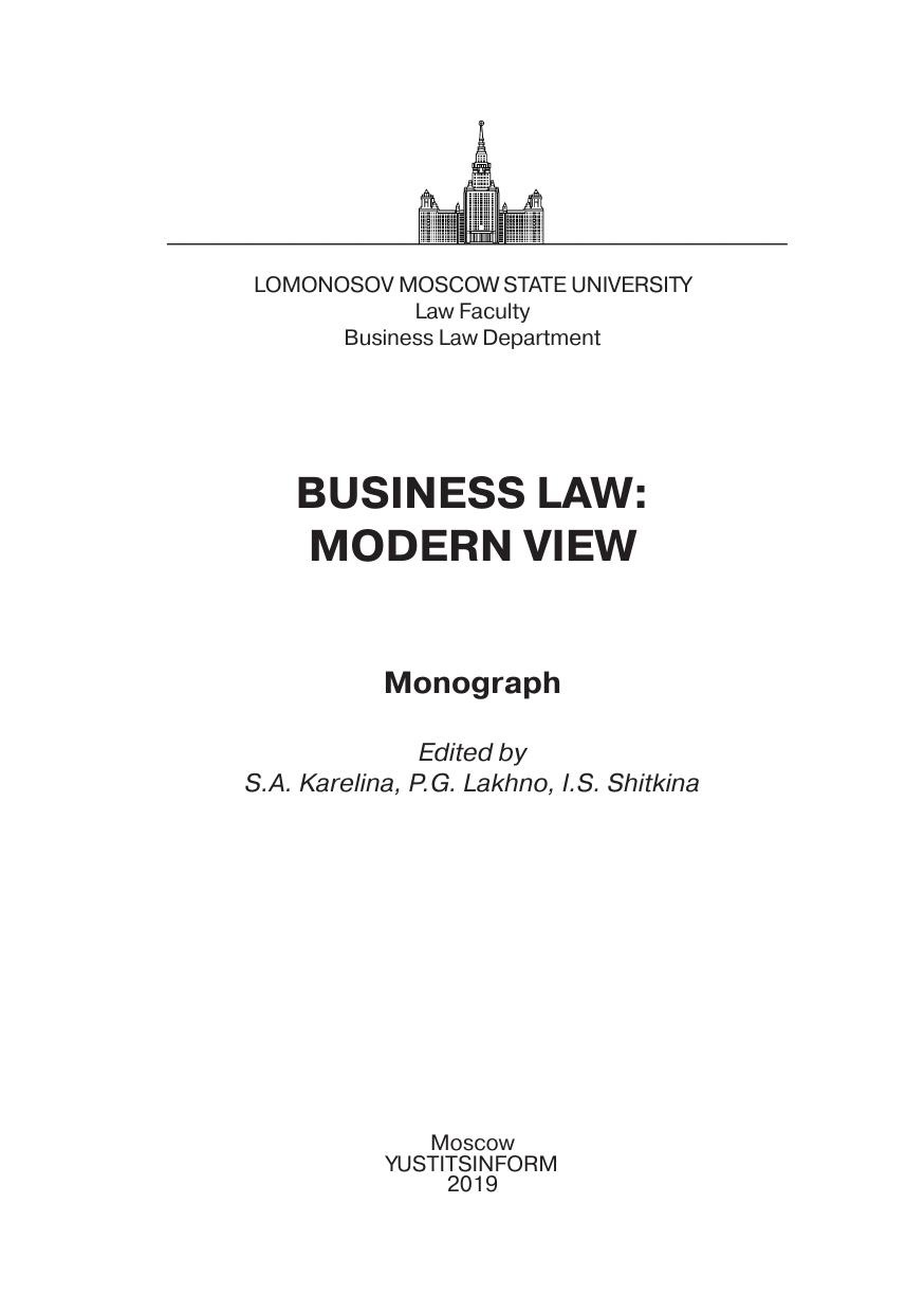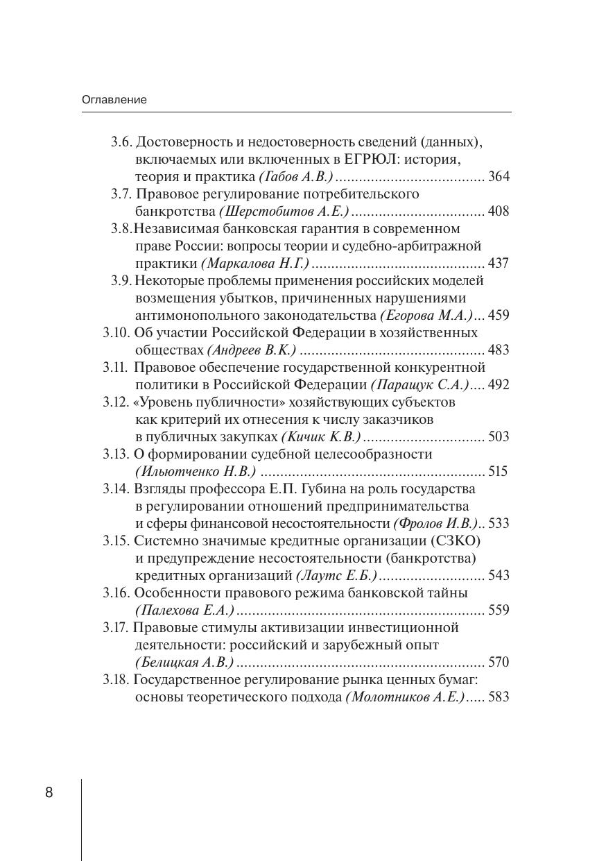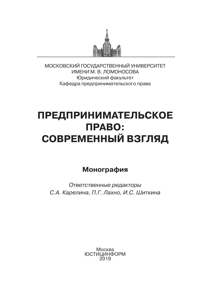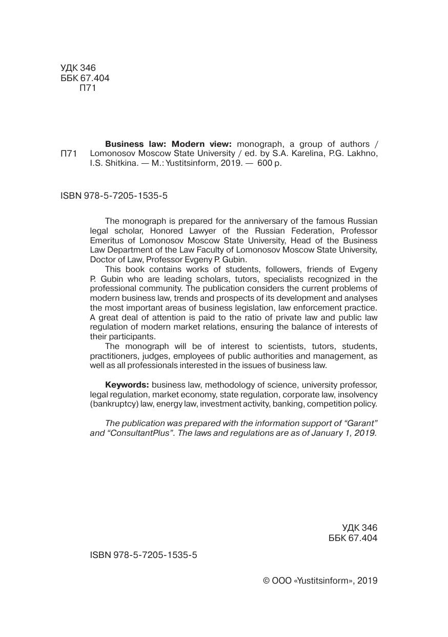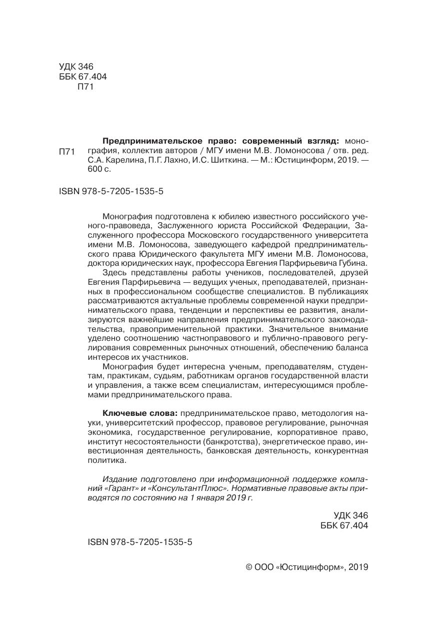 Монография подготовлена к юбилею известного российского ученого-правоведа, Заслуженного юриста Российской Федерации, Заслуженного профессора Московского государственного университета имени М.В. Ломоносова, заведующего кафедрой предпринимательского права Юридического факультета МГУ имени М.В. Ломоносова, доктора юридических наук, профессора Евгения Парфирьевича Губина. Здесь представлены работы учеников, последователей, друзей Евгения Парфирьевича — ведущих ученых, преподавателей, признанных в профессиональном сообществе специалистов. В публикациях рассматриваются актуальные проблемы современной науки предпринимательского права, тенденции и перспективы ее развития, анализируются важнейшие направления предпринимательского законода- тельства, правоприменительной практики. Значительное внимание уделено соотношению частноправового и публично правового регулирования современных рыночных отношений, обеспечению баланса интересов их участников. Монография будет интересна ученым, преподавателям, студентам, практикам, судьям, работникам органов государственной власти и управления, а также всем специалистам, интересующимся проблемами предпринимательского права