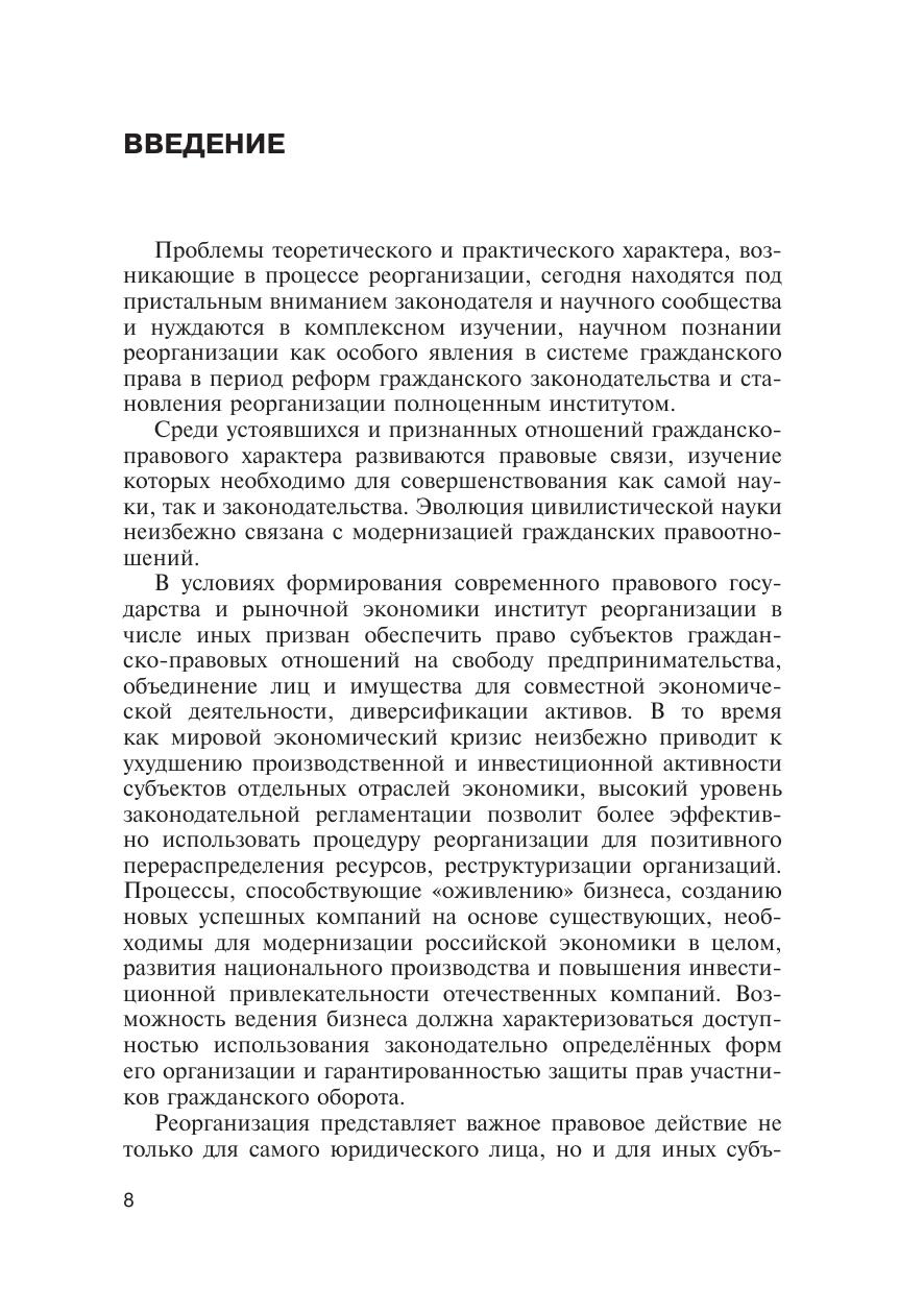 В настоящей монографии проведено комплексное исследование института реорганизации юридического лица, в том числе проблем правового регулирования и последних изменений гражданского законодательства о юридических лицах; определены теоретические и практические основы реорганизации как системы правоотношений, направленные на изменение правового положения (изменение обязательственных, вещных и корпоративных отношений) реорганизуемых юридических лиц; изучены отдельные элементы реорганизационных правоотношений; дана оценка новым нормам гражданского законодательства о реорганизации юридического лица. Книга предназначена для практикующих юристов, студентов юридических вузов, преподавателей и научных работников.