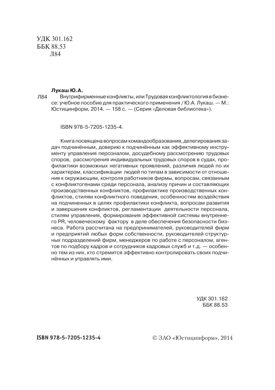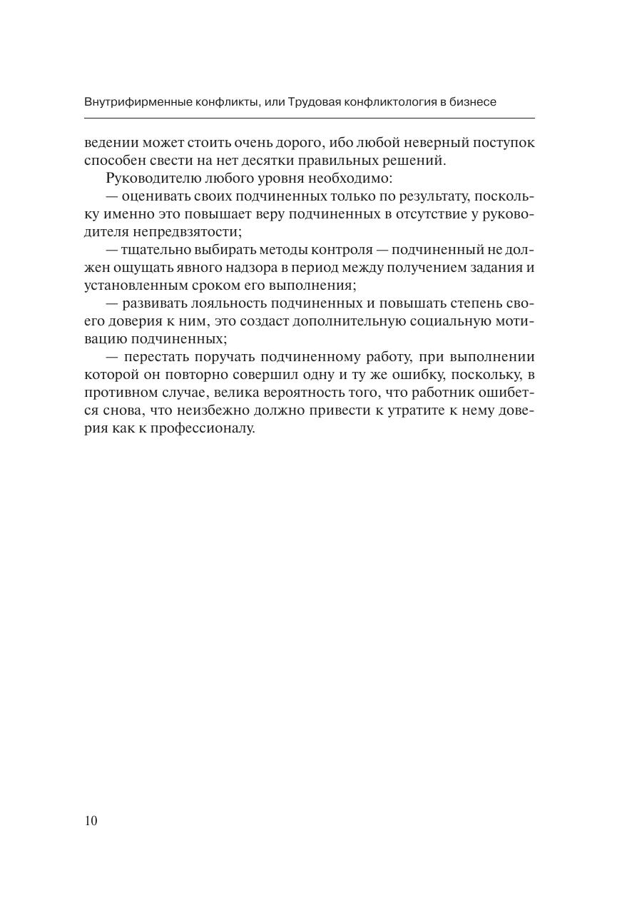 Книга посвящена вопросам командообразования, делегирования задач подчинённым, доверию к подчинённым как эффективному инструменту управления персоналом, досудебному рассмотрению трудовых споров, рассмотрения индивидуальных трудовых споров в судах, профилактики возможных негативных проявлений, различия людей по их характерам, классификации людей по типам в зависимости от отношения к окружающим, контроля работников фирмы, вопросам, связанным с конфликтогенами среди персонала, анализу причин и составляющих производственных конфликтов, профилактике производственных конфликтов, стилям конфликтного поведения, особенностям воздействия на подчиненных в целях профилактики конфликта, вопросам развития и завершения конфликтов, регламентации деятельности персонала, стилям управления, формирования эффективной системы внутреннего PR, человеческому фактору в деле обеспечения безопасности бизнеса. Работа рассчитана на предпринимателей, руководителей фирм и предприятий любых форм собственности, руководителей структурных подразделений фирм, менеджеров по работе с персоналом, агентов по подбору кадров и сотрудников кадровых служб и т.д. — особенно тем из них, кто стремится эффективно контролировать своих подчинённых и управлять ими