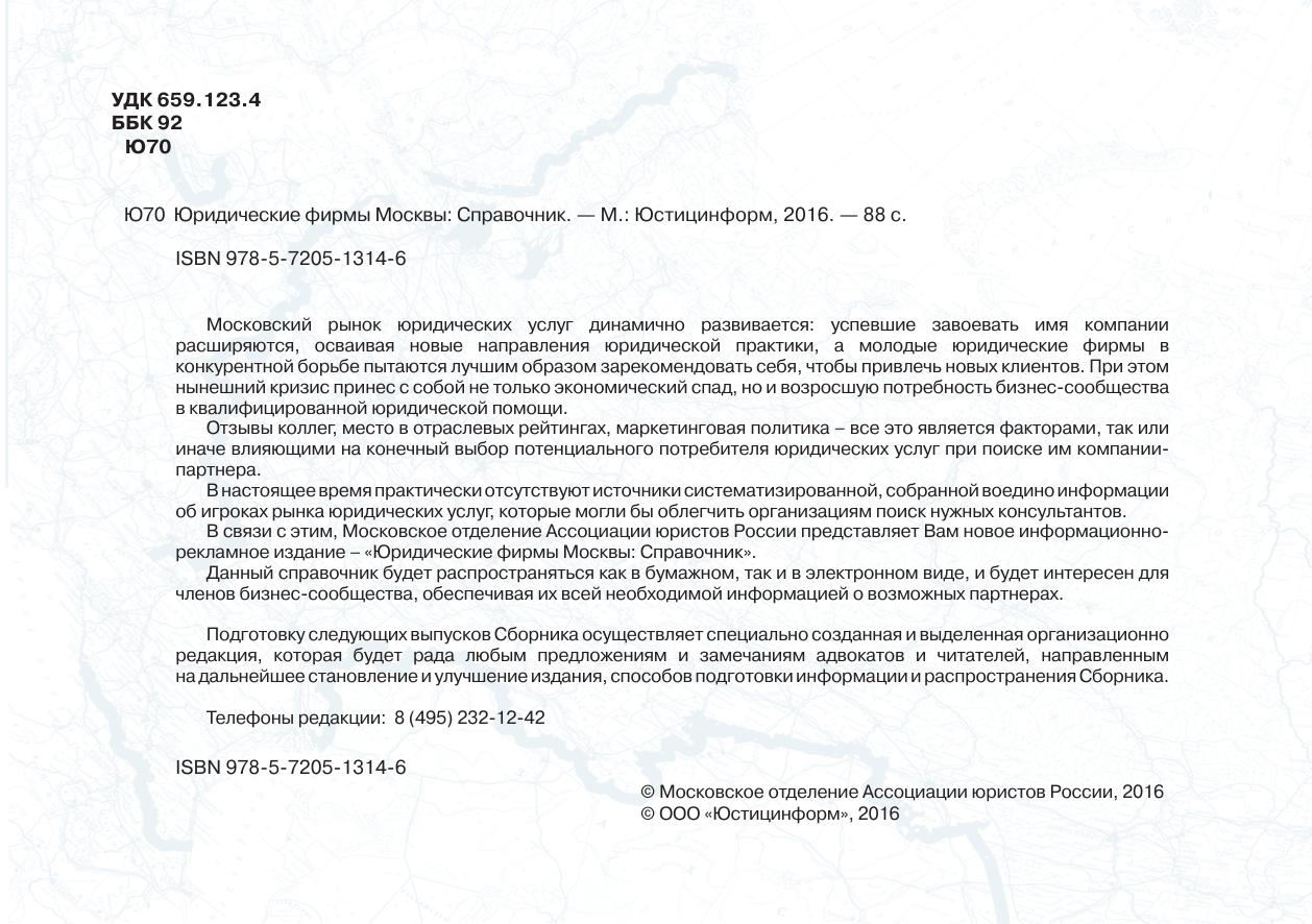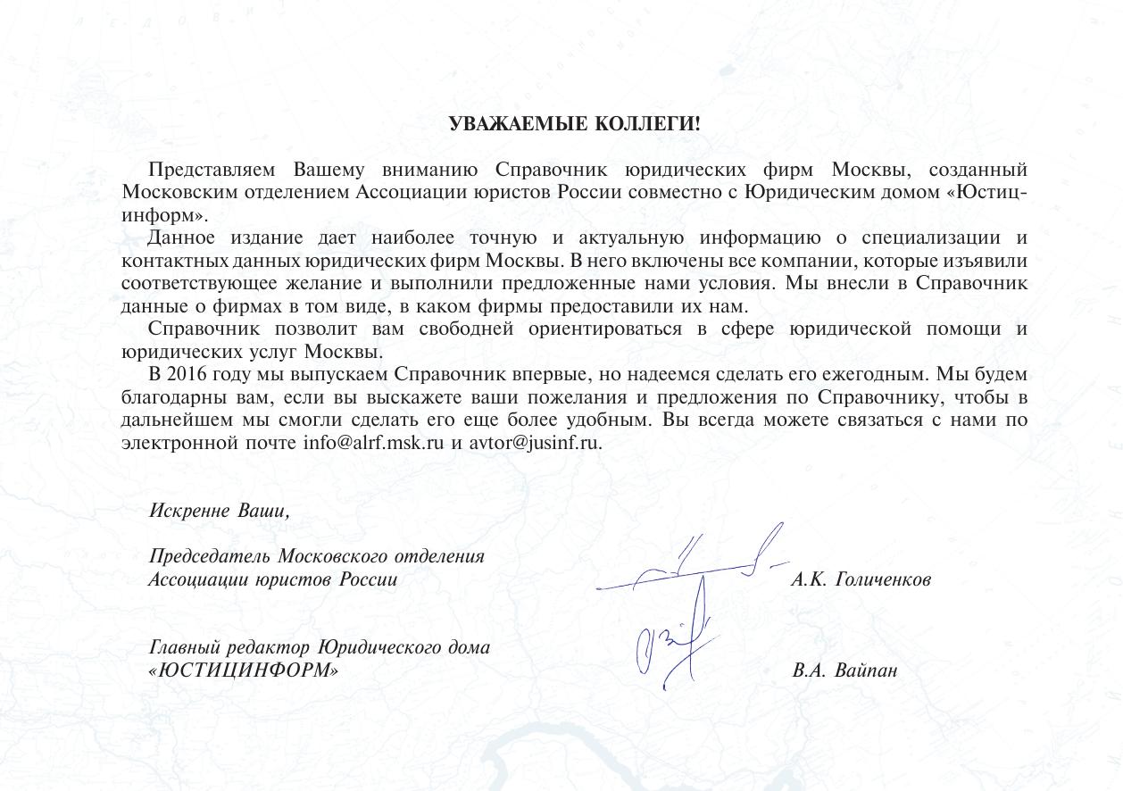 В настоящее время практически отсутствуют источники систематизированной, собранной воедино информации об игроках рынка юридических услуг, которые могли бы облегчить организациям поиск нужных консультантов. В связи с этим, Московское отделение Ассоциации юристов России представляет Вам новое информационно-рекламное издание – «Юридические фирмы Москвы: Справочник». Данный справочник будет распространяться как в бумажном, так и в электронном виде, и будет интересен для членов бизнес-сообщества, обеспечивая их всей необходимой информацией о возможных партнерах. Подготовку следующих выпусков Сборника осуществляет специально созданная и выделенная организационно редакция, которая будет рада любым предложениям и замечаниям адвокатов и читателей, направленным на дальнейшее становление и улучшение издания, способов подготовки информации и распространения Сборника.