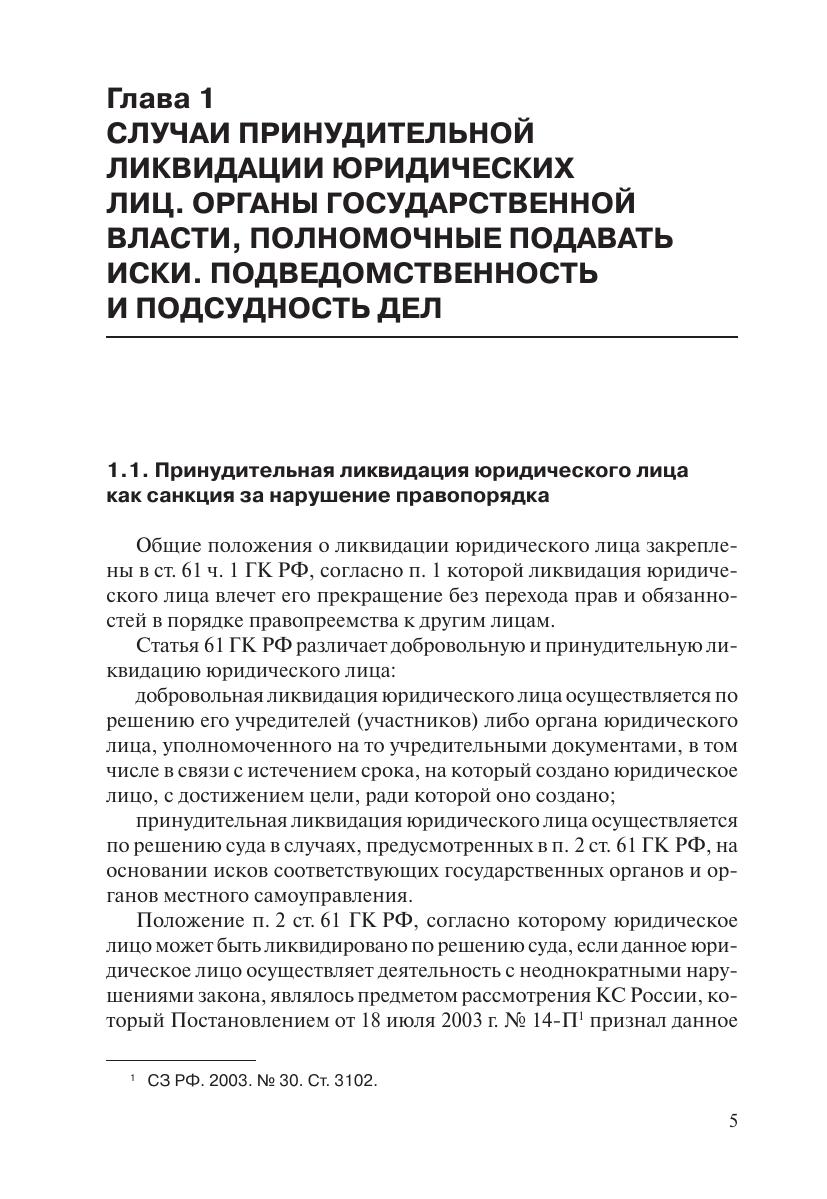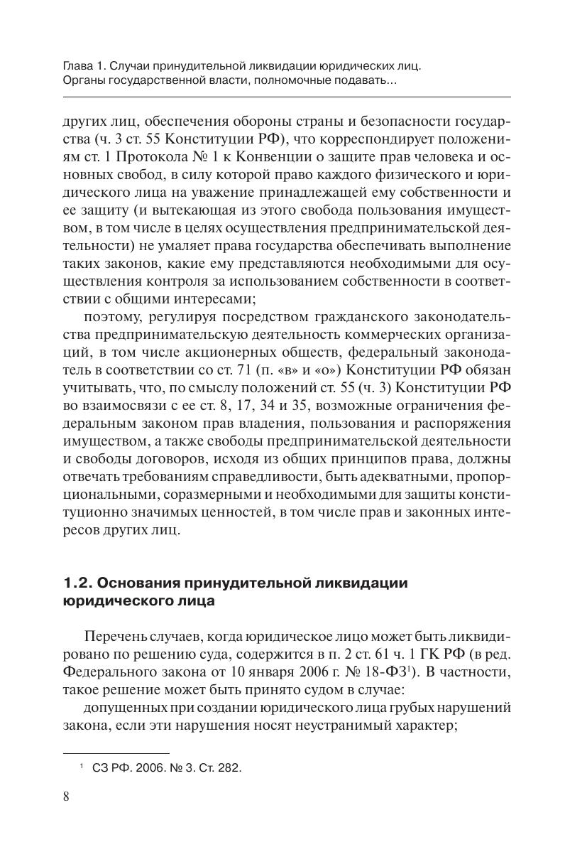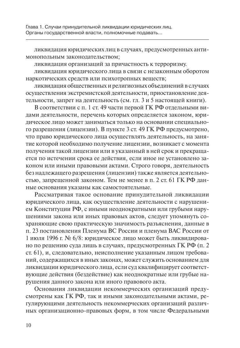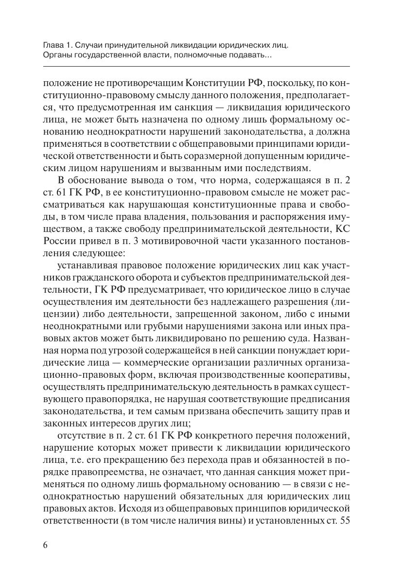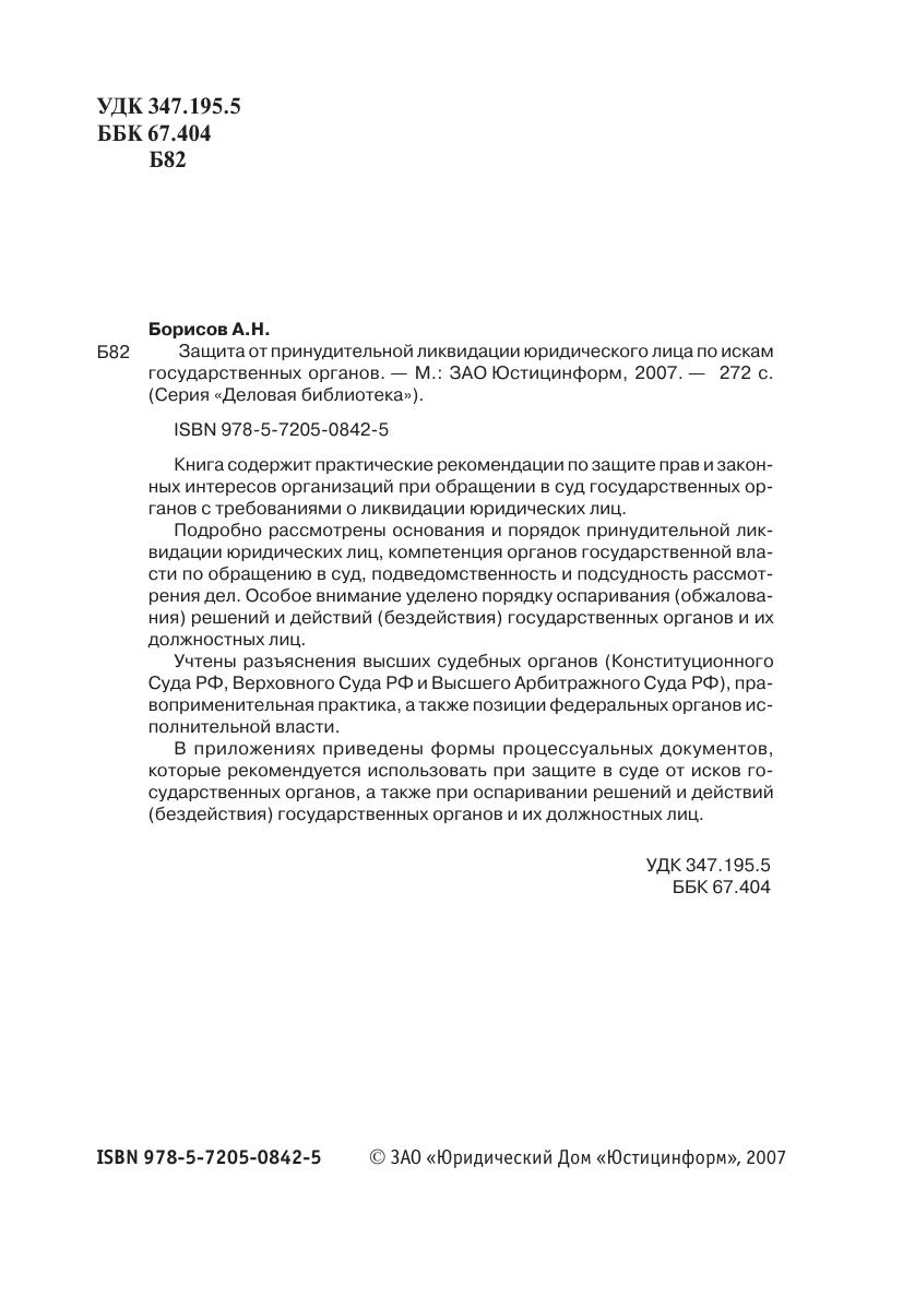 Книга содержит практические рекомендации по защите прав и законных интересов организаций при обращении в суд государственных органов с требованиями о ликвидации юридических лиц.Подробно рассмотрены основания и порядок принудительной ликвидации юридических лиц, компетенция органов государственной власти по обращению в суд, подведомственность и подсудность рассмотрения дел. Особое внимание уделено порядку оспаривания (обжалования) решений и действий (бездействия) государственных органов и их должностных лиц.Учтены разъяснения высших судебных органов (Конституционного Суда РФ, Верховного Суда РФ и Высшего Арбитражного Суда РФ), правоприменительная практика, а также позиции федеральных органов исполнительной власти.В приложениях приведены формы процессуальных документов, которые рекомендуется использовать при защите в суде от исков государственных органов, а также при оспаривании решений и действий (бездействия) государственных органов и их должностных лиц.