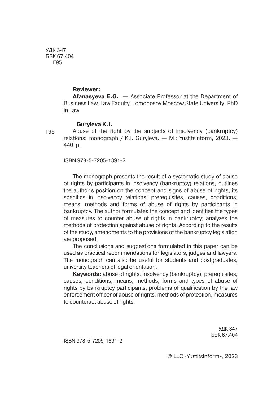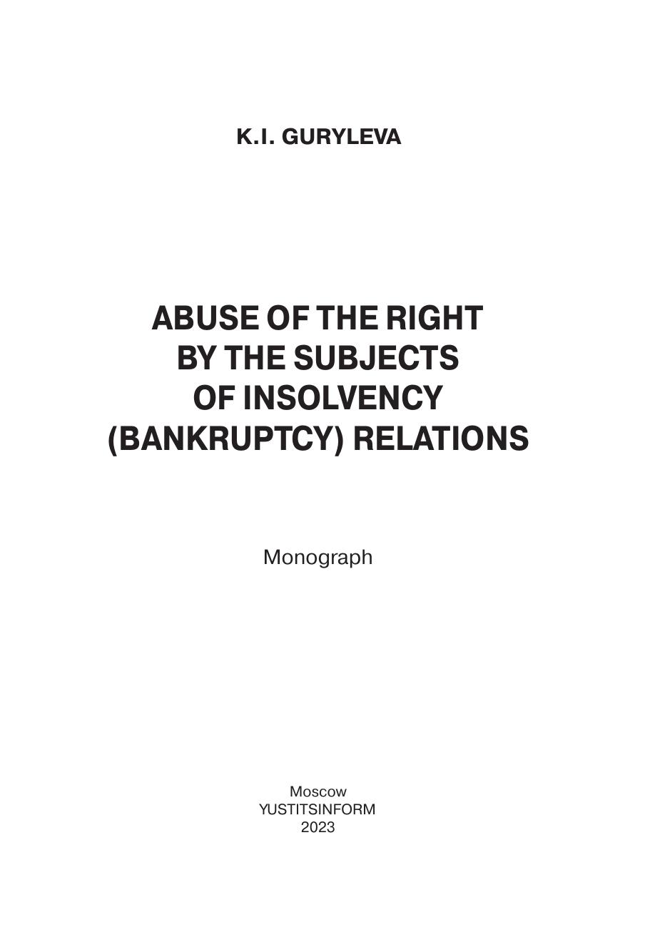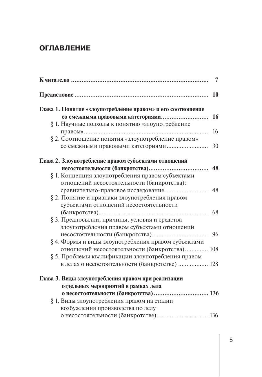 В монографии представлен результат системного исследования злоупотребления правами участниками отношений несостоятельности (банкротства), изложена авторская позиция относительно понятия и признаков злоупотребления правами, его специфики в отношениях несостоятельности; предпосылок, причин, условий, средств, способов и форм злоупотреблений правами участниками банкротства. Автором сформулировано понятие и выявлены виды мер противодействия злоупотреблению правами при банкротстве, проанализированы способы защиты от злоупотреблений правами. По результатам исследования предложены изменения положений законодательства о банкротстве.