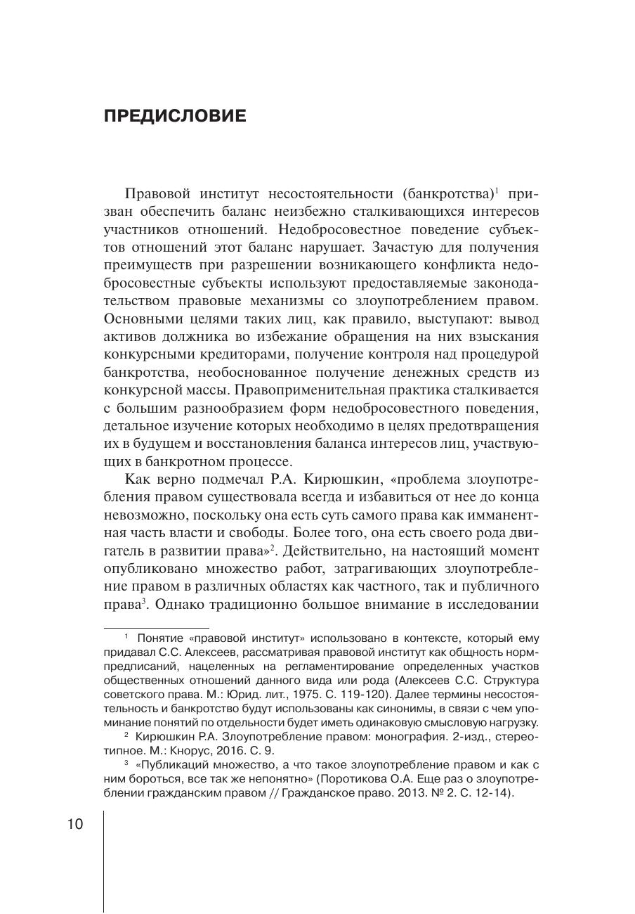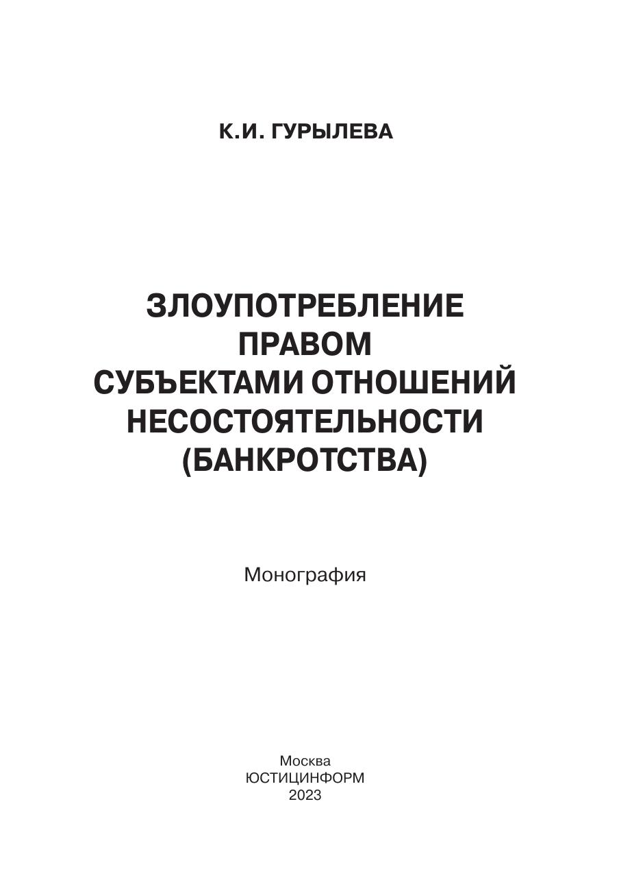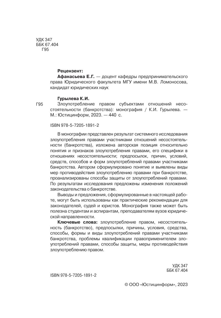 В монографии представлен результат системного исследования злоупотребления правами участниками отношений несостоятельности (банкротства), изложена авторская позиция относительно понятия и признаков злоупотребления правами, его специфики в отношениях несостоятельности; предпосылок, причин, условий, средств, способов и форм злоупотреблений правами участниками банкротства. Автором сформулировано понятие и выявлены виды мер противодействия злоупотреблению правами при банкротстве, проанализированы способы защиты от злоупотреблений правами. По результатам исследования предложены изменения положений законодательства о банкротстве.