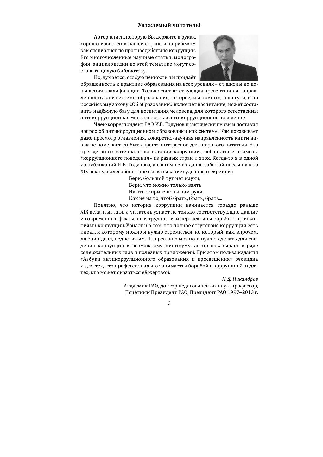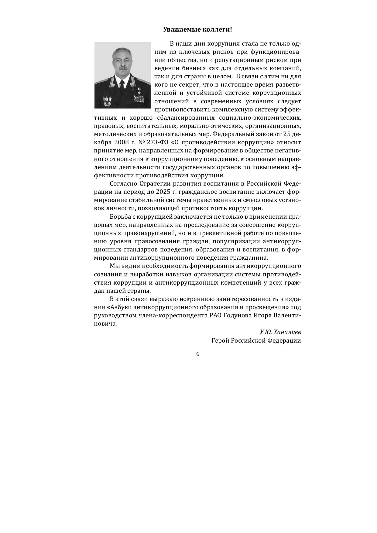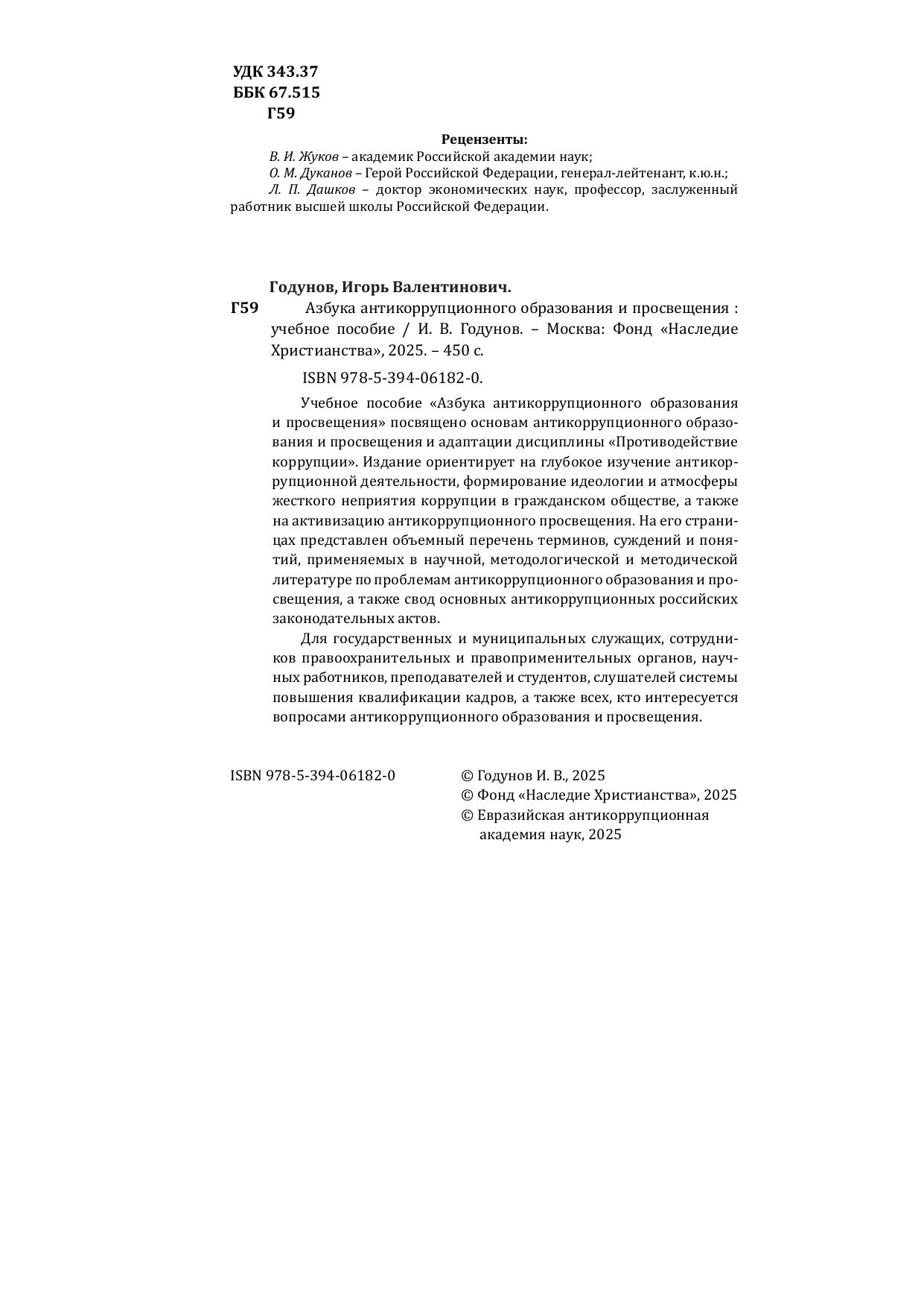 Учебное пособие «Азбука антикоррупционного образования и просвещения» посвящено основам антикоррупционного образования и просвещения и адаптации дисциплины «Противодействие коррупции». Издание ориентирует на глубокое изучение антикоррупционной деятельности, формирование идеологии и атмосферы жесткого неприятия коррупции в гражданском обществе, а также на активизацию антикоррупционного просвещения. На его страницах представлен объемный перечень терминов, суждений и понятий, применяемых в научной, методологической и методической литературе по проблемам антикоррупционного образования и просвещения, а также свод основных антикоррупционных российских