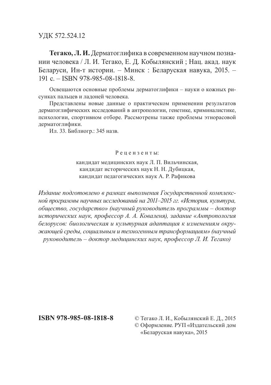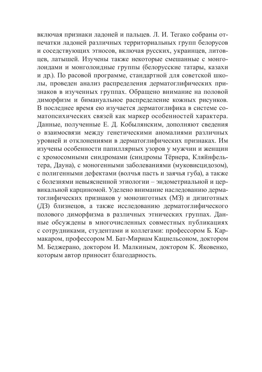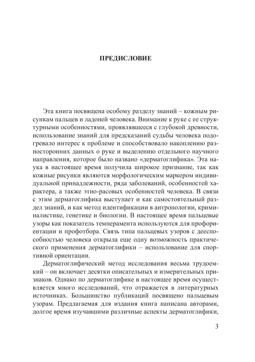 Освещаются основные проблемы дерматоглифики – науки о кожных рисунках пальцев и ладоней человека. Представлены новые данные о практическом применении результатов дерматоглифических исследований в антропологии, генетике, криминалистике, психологии, спортивном отборе. Рассмотрены также проблемы этнорасовой дерматоглифики.