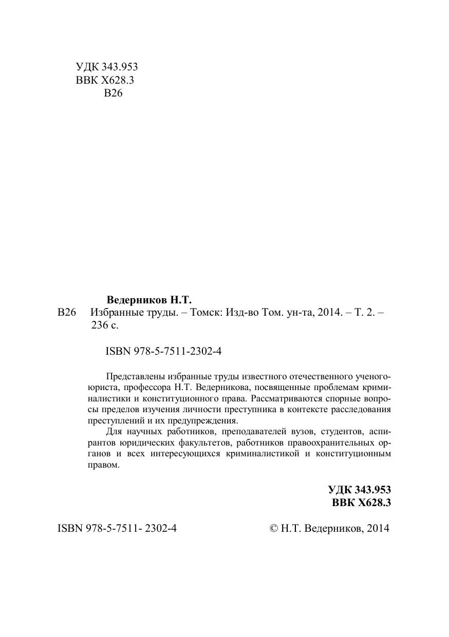 Представлены избранные труды известного отечественного ученого-юриста, профессора Н.Т. Ведерникова, посвященные проблемам криминалистики и конституционного права. Рассматриваются спорные вопросы пределов изучения личности преступника в контексте расследования преступлений и их предупреждения. Для научных работников, преподавателей вузов, студентов, аспирантов юридических факультетов, работников правоохранительных органов и всех интересующихся криминалистикой и конституционным правом.