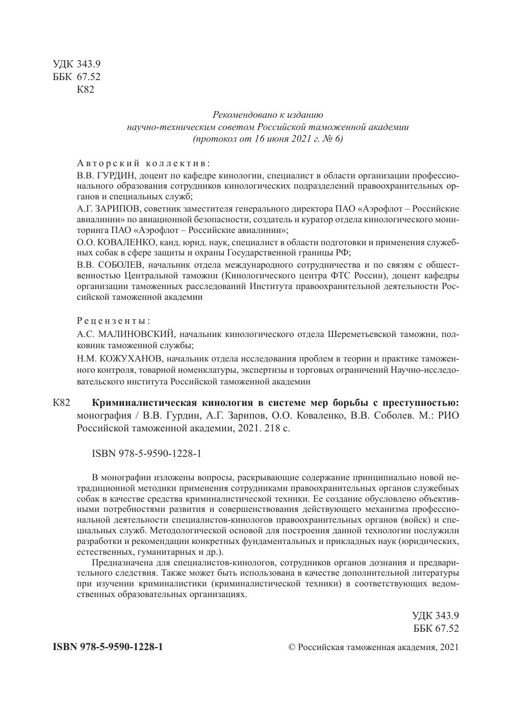 В монографии изложены вопросы, раскрывающие содержание принципиально новой нетрадиционной методики применения сотрудниками правоохранительных органов служебных собак в качестве средства криминалистической техники. ее создание обусловлено объективными потребностями развития и совершенствования действующего механизма профессио-
