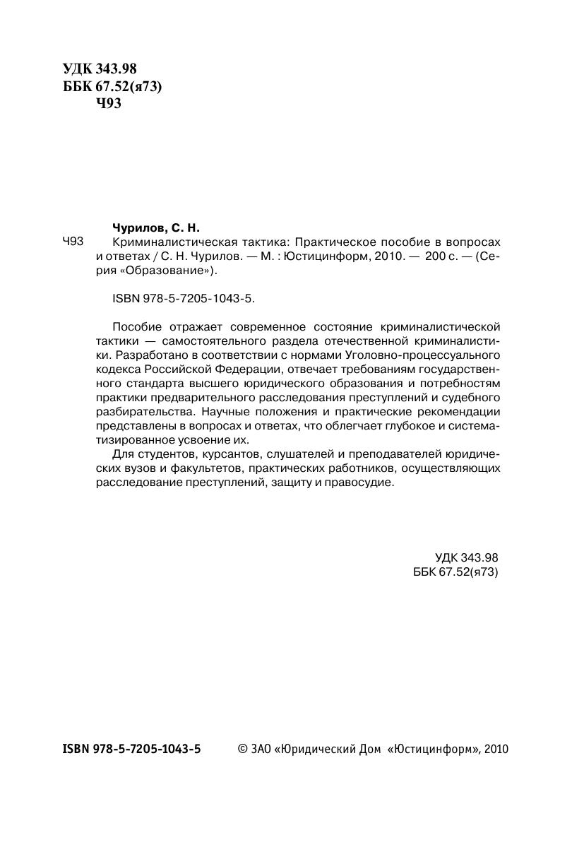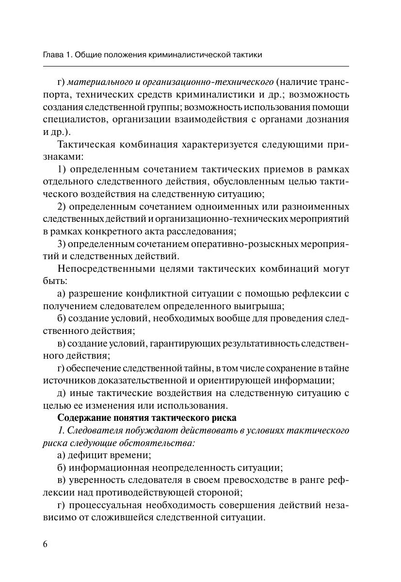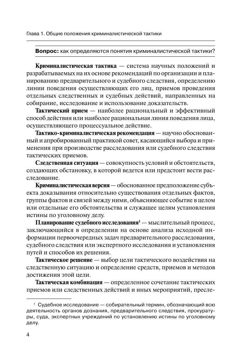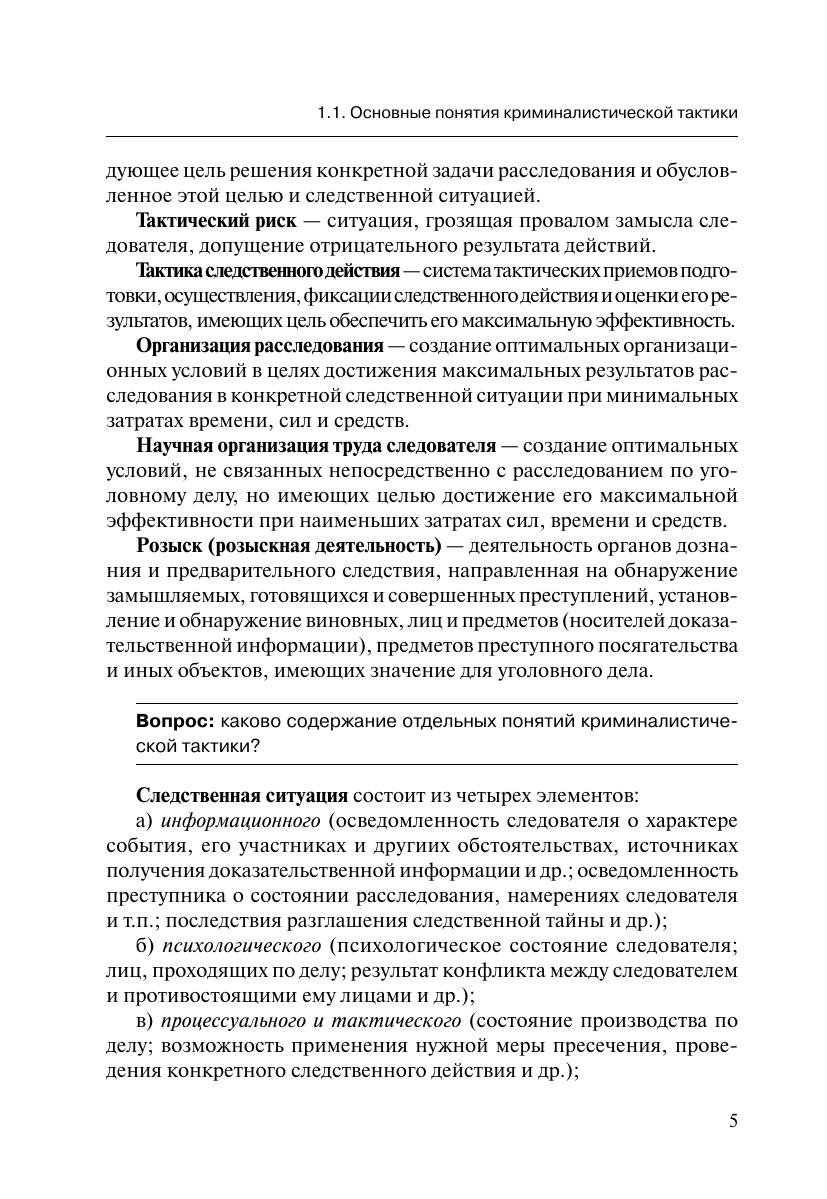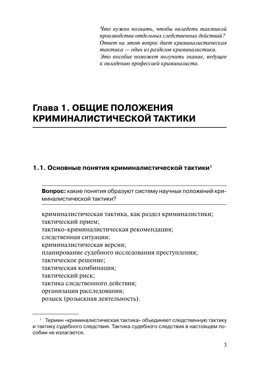Пособие отражает современное состояние криминалистической тактики — самостоятельного раздела отечественной криминалистики. Разработано в соответствии с нормами Уголовно-процессуального кодекса Российской Федерации, отвечает требованиям государственного стандарта высшего юридического образования и потребностям практики предварительного расследования преступлений и судебного разбирательства. Научные положения и практические рекомендации представлены в вопросах и ответах, что облегчает глубокое и систематизированное усвоение их.Для студентов, курсантов, слушателей и преподавателей юридических вузов и факультетов, практических работников, осуществляющих расследование преступлений, защиту и правосудие.
