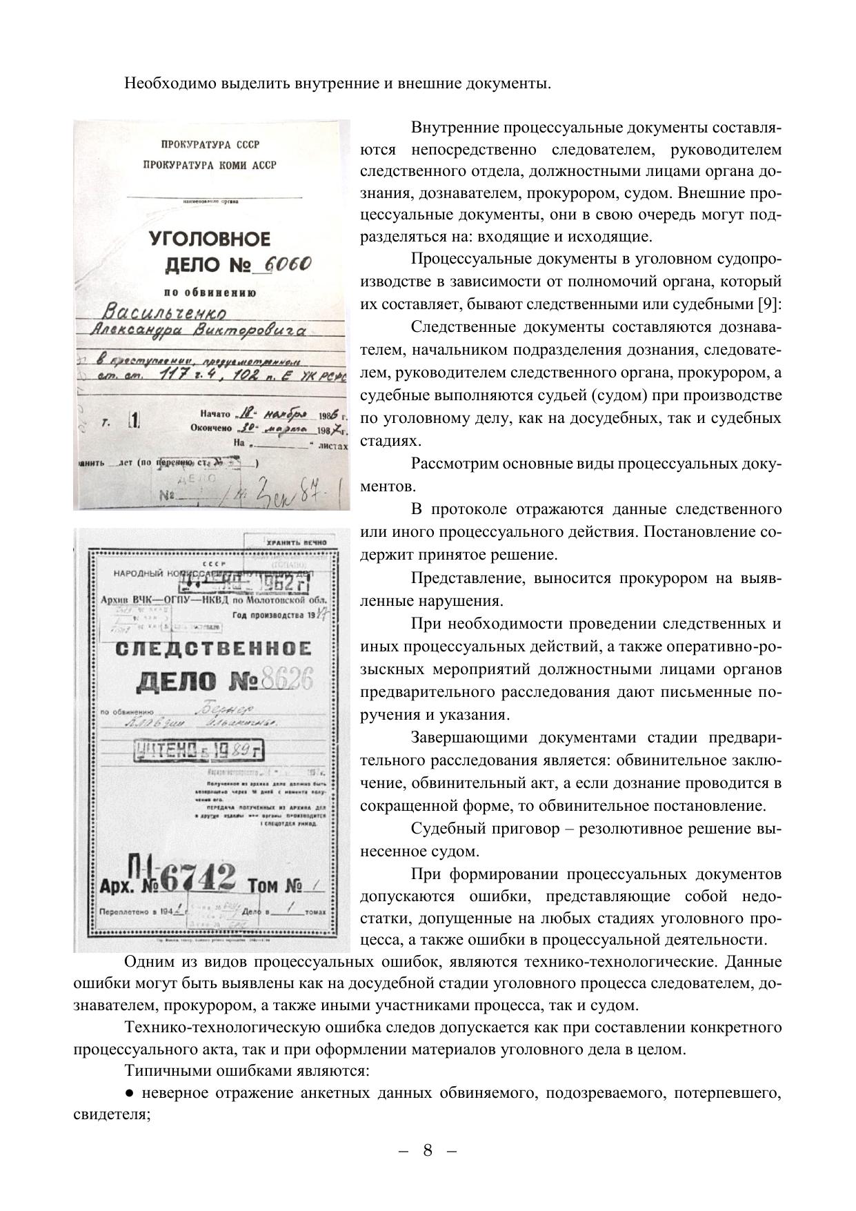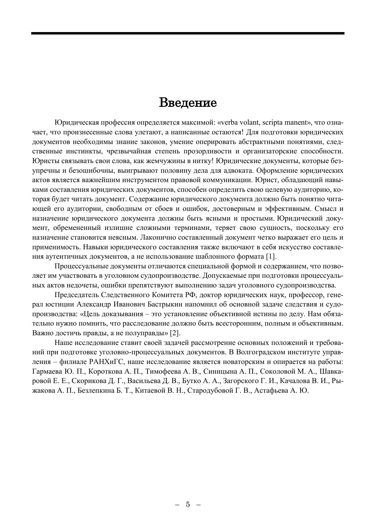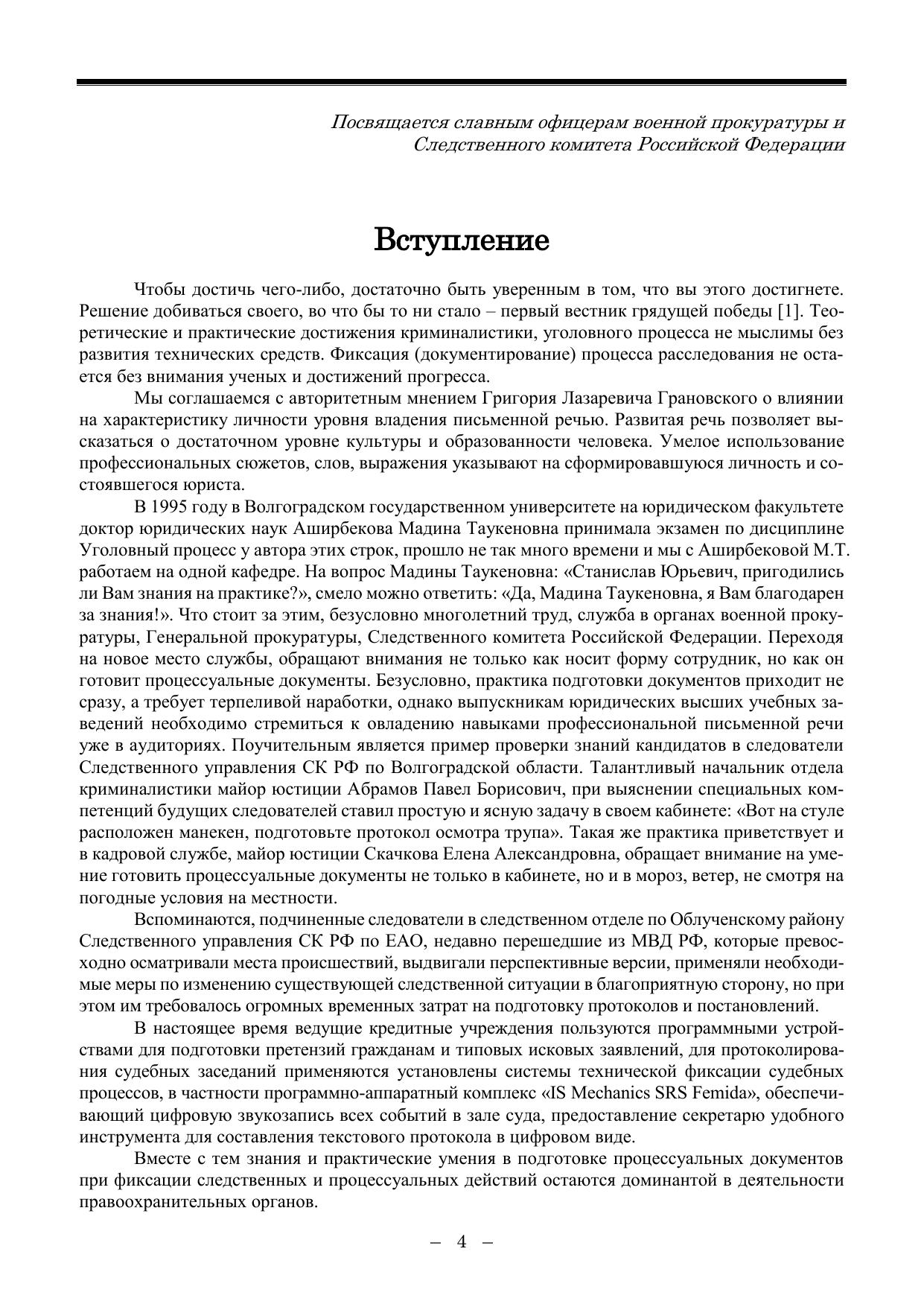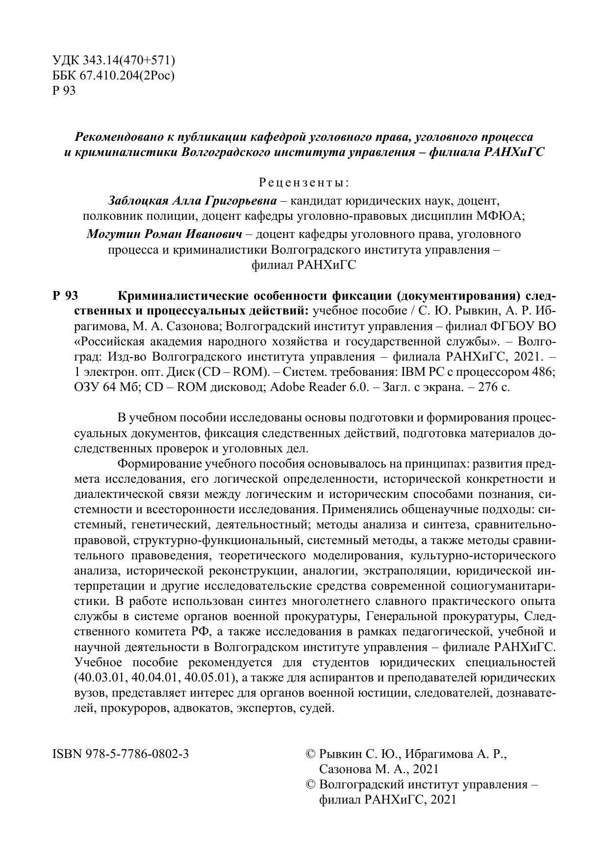 В учебном пособии исследованы основы подготовки и формирования процессуальных документов, фиксация следственных действий, подготовка материалов доследственных проверок и уголовных дел. Формирование учебного пособия основывалось на принципах: развития предмета исследования, его логической определенности, исторической конкретности и диалектической связи между логическим и историческим способами познания, системности и всесторонности исследования. Применялись общенаучные подходы: системный, генетический, деятельностный; методы анализа и синтеза, сравнительноправовой, структурно-функциональный, системный методы, а также методы сравнительного правоведения, теоретического моделирования, культурно-исторического анализа, исторической реконструкции, аналогии, экстраполяции, юридической интерпретации и другие исследовательские средства современной социогуманитаристики. В работе использован синтез многолетнего славного практического опыта службы в системе органов военной прокуратуры, Генеральной прокуратуры, Следственного комитета РФ, а также исследования в рамках педагогической, учебной и научной деятельности в Волгоградском институте управления – филиале РАНХиГС. Учебное пособие рекомендуется для студентов юридических специальностей (40.03.01, 40.04.01, 40.05.01), а также для аспирантов и преподавателей юридических вузов, представляет интерес для органов военной юстиции, следователей, дознавателей, прокуроров, адвокатов, экспертов, судей.