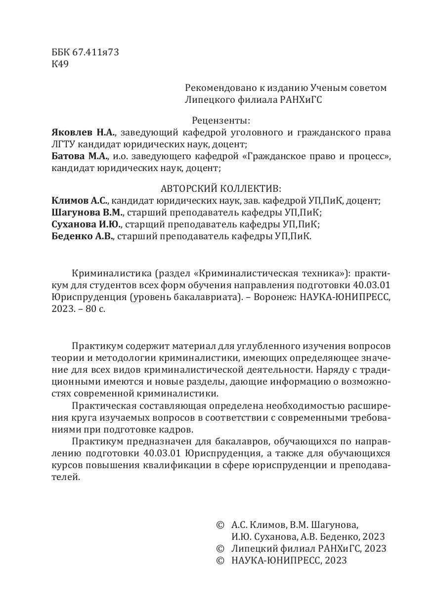 Криминалистика (раздел "Криминалистическая техника"): практикум для студентов всех форм обучения направления подготовки 40.03.01 Юриспруденция (уровень бакалавриата)