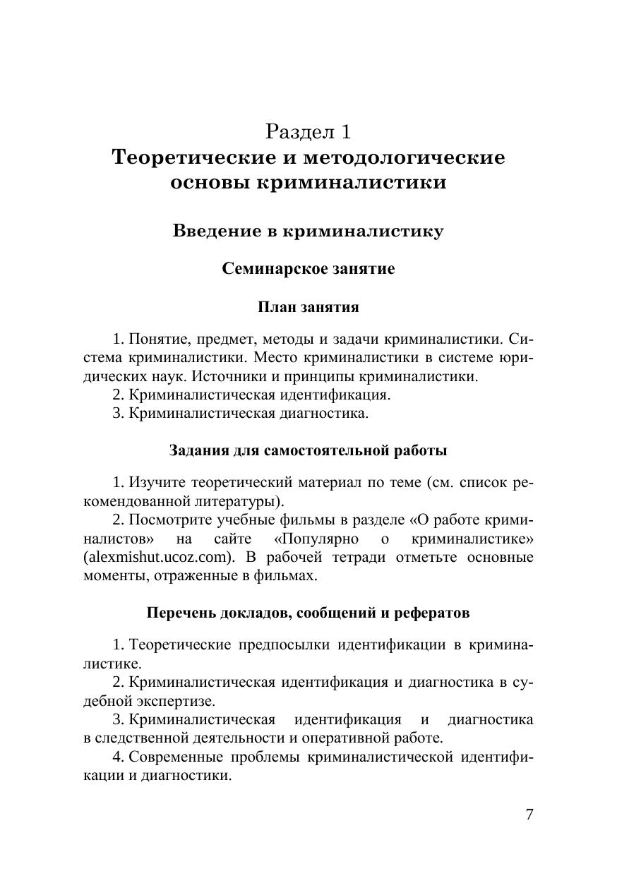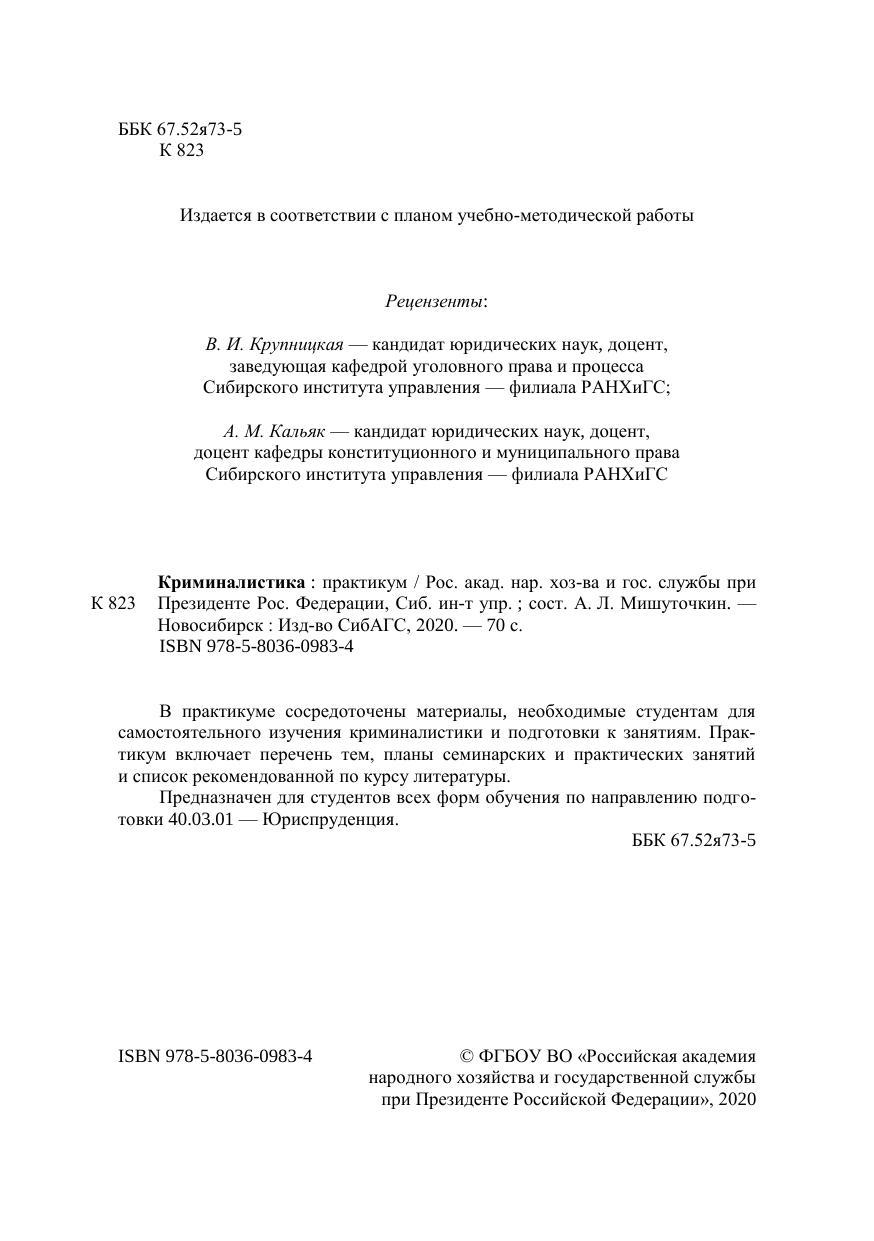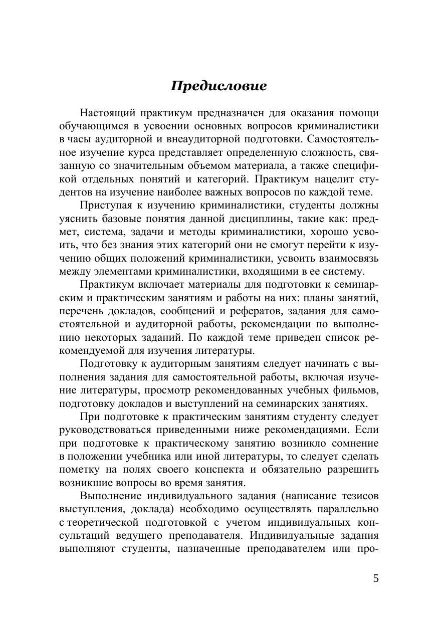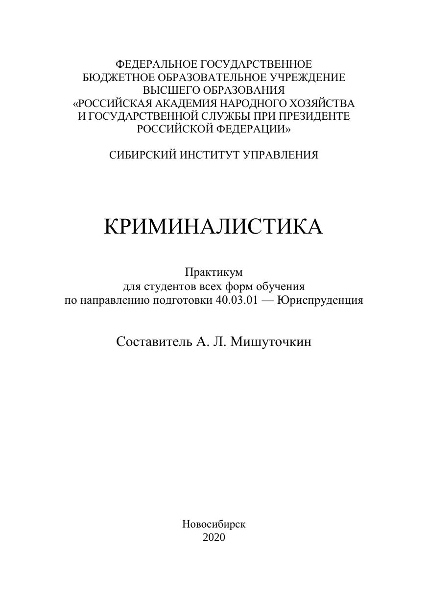 В практикуме сосредоточены материалы, необходимые студентам для самостоятельного изучения криминалистики и подготовки к занятиям. Прак-тикум включает перечень тем, планы семинарских и практических занятий и список рекомендованной по курсу литературы. Предназначен для студентов всех форм обучения по направлению подго-товки 40.03.01 — Юриспруденция.