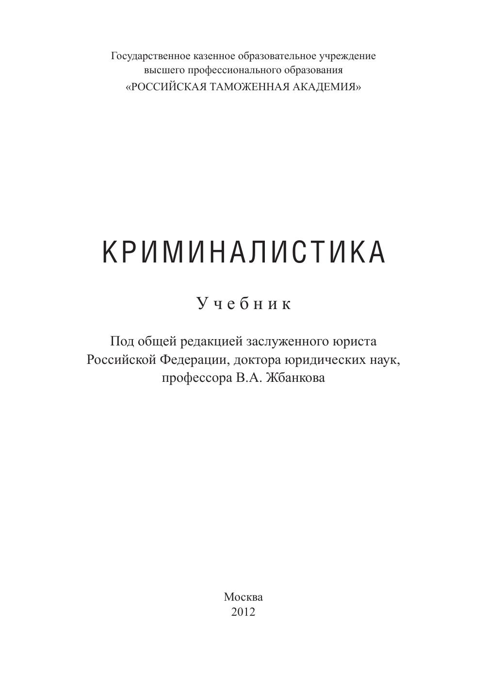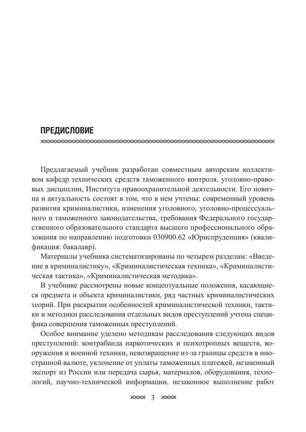 В учебнике рассматриваются предмет, система и задачи криминалистики, криминалистическая идентификация и диагностика. С позиций современной науки излагаются положения криминалистической техники, криминалистической тактики и криминалистической методики. Особое внимание уделяется методике расследования: контрабанды наркотических средств и психотропных веществ; военной техники и вооружения; невозвращения из-за границы средств в иностранной валюте; неуплаты таможенных платежей; незаконного экспорта или передачи сырья, материалов, оборудования, технологий, научно-технической информации, незаконного выполнения работ (оказания услуг), которые могут быть использованы при создании оружия массового поражения, вооружения и военной техники; невозвращения на территорию РФ предметов художественного, исторического и археологического достояния народов РФ и зарубежных стран. Предназначен для студентов, обучающихся по направлению подготовки 030900.62 «Юриспруденция», а также может быть использован аспирантами, слушателями Института правоохранительной деятельности, специалистами-практиками