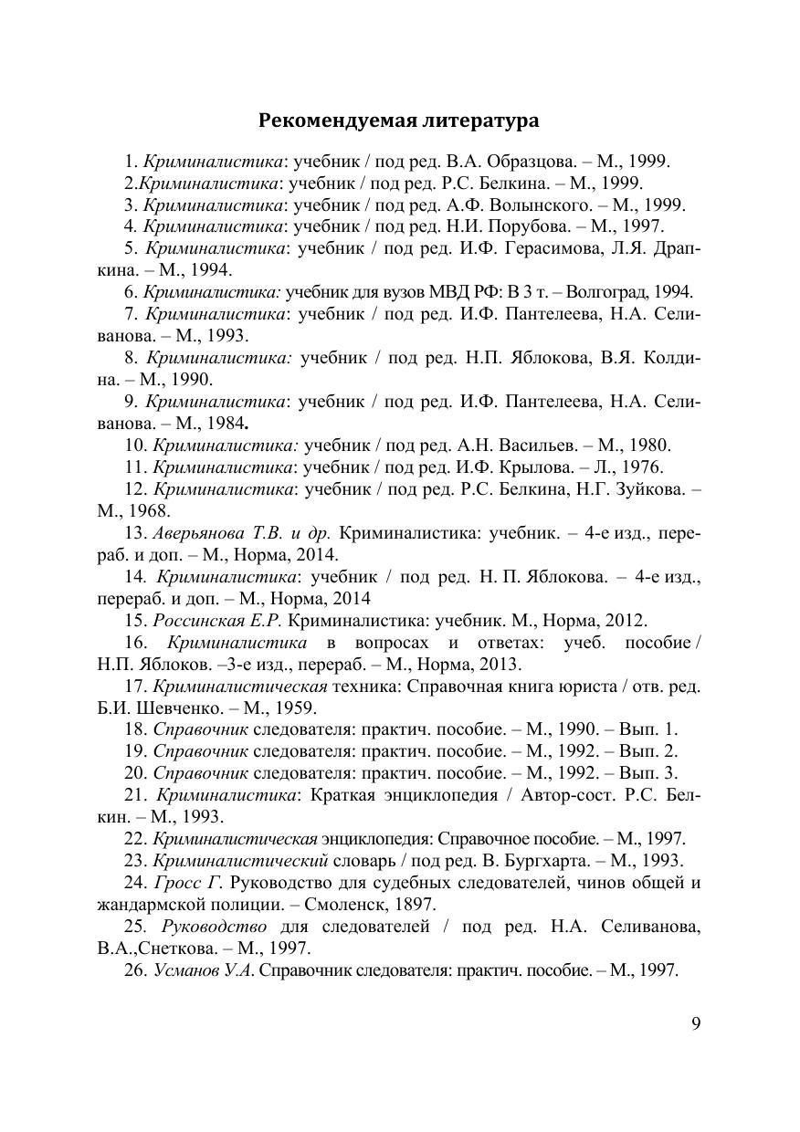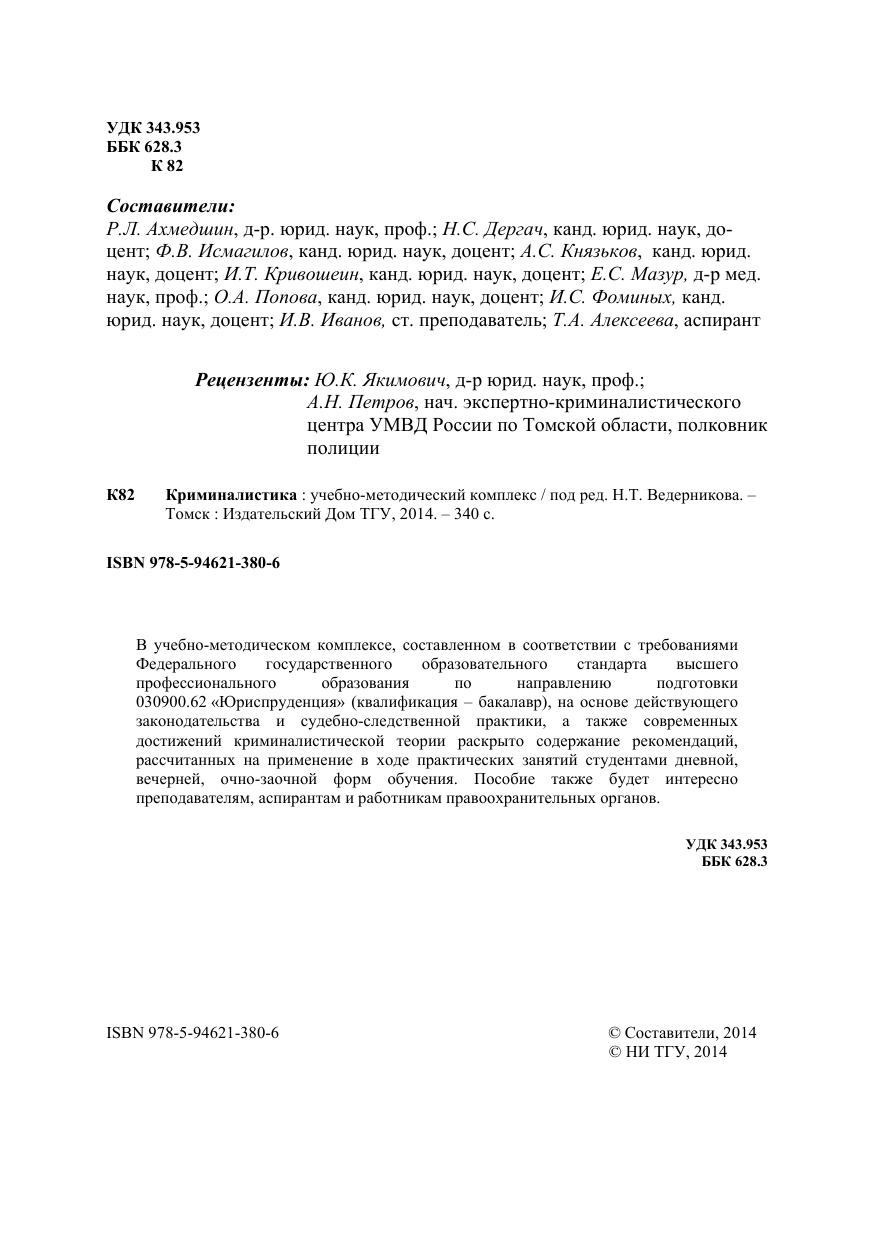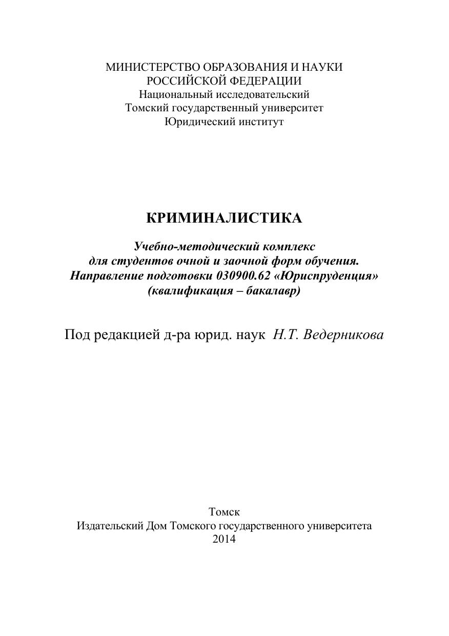 В учебно-методическом комплексе, составленном в соответствии с требованиями Федерального государственного образовательного стандарта высшего профессионального образования по направлению подготовки 030900.62 «Юриспруденция» (квалификация – бакалавр), на основе действующего законодательства и судебно-следственной практики, а также современных достижений криминалистической теории раскрыто содержание рекомендаций, рассчитанных на применение в ходе практических занятий студентами дневной, вечерней, очно-заочной форм обучения. Пособие также будет интересно преподавателям, аспирантам и работникам правоохранительных органов.