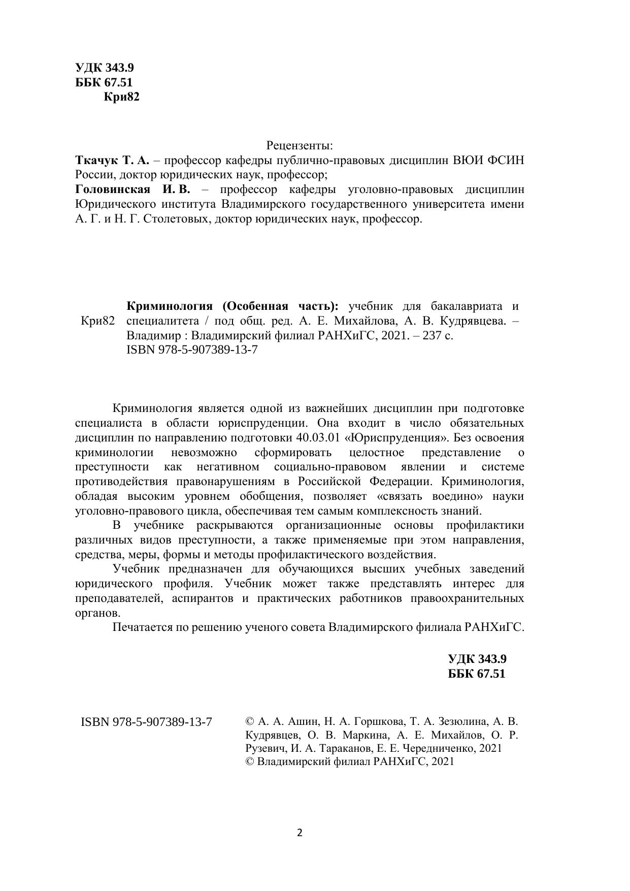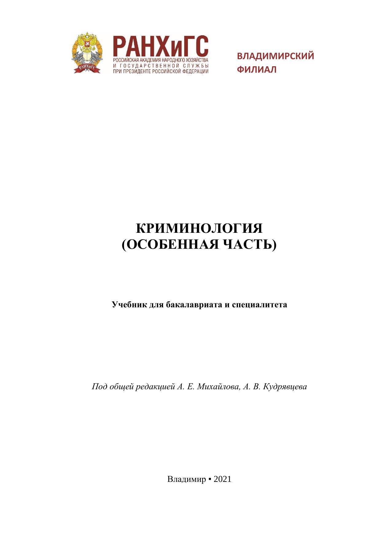 Криминология является одной из важнейших дисциплин при подготовке специалиста в области юриспруденции. Она входит в число обязательных дисциплин по направлению подготовки 40.03.01 «Юриспруденция». Без освоения криминологии невозможно сформировать целостное представление о преступности как негативном социально-правовом явлении и системе противодействия правонарушениям в Российской Федерации. Криминология, обладая высоким уровнем обобщения, позволяет «связать воедино» науки уголовно-правового цикла, обеспечивая тем самым комплексность знаний. В учебнике раскрываются организационные основы профилактики различных видов преступности, а также применяемые при этом направления, средства, меры, формы и методы профилактического воздействия. Учебник предназначен для обучающихся высших учебных заведений юридического профиля. Учебник может также представлять интерес для преподавателей, аспирантов и практических работников правоохранительных органов. Печатается по решению ученого совета Владимирского филиала РАНХиГС.