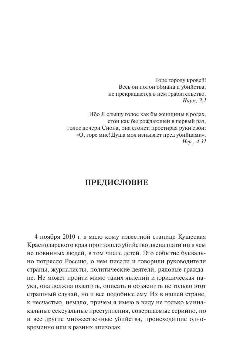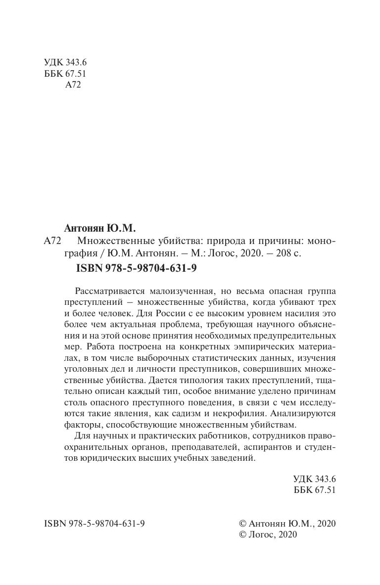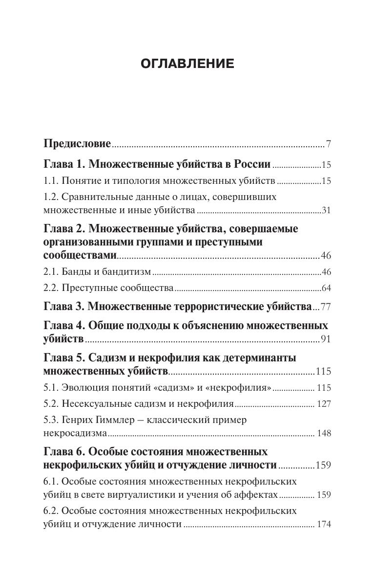 Рассматривается малоизученная, но весьма опасная группа преступлений – множественные убийства, когда убивают трех и более человек. Для России с ее высоким уровнем насилия это более чем актуальная проблема, требующая научного объяснения и на этой основе принятия необходимых предупредительных мер. Работа построена на конкретных эмпирических материалах, в том числе выборочных статистических данных, изучения уголовных дел и личности преступников, совершивших множественные убийства. Дается типология таких преступлений, тщательно описан каждый тип, особое внимание уделено причинам столь опасного преступного поведения, в связи с чем исследуются такие явления, как садизм и некрофилия. Анализируются факторы, способствующие множественным убийствам. Для научных и практических работников, сотрудников правоохранительных органов, преподавателей, аспирантов и студентов юридических высших учебных заведений.